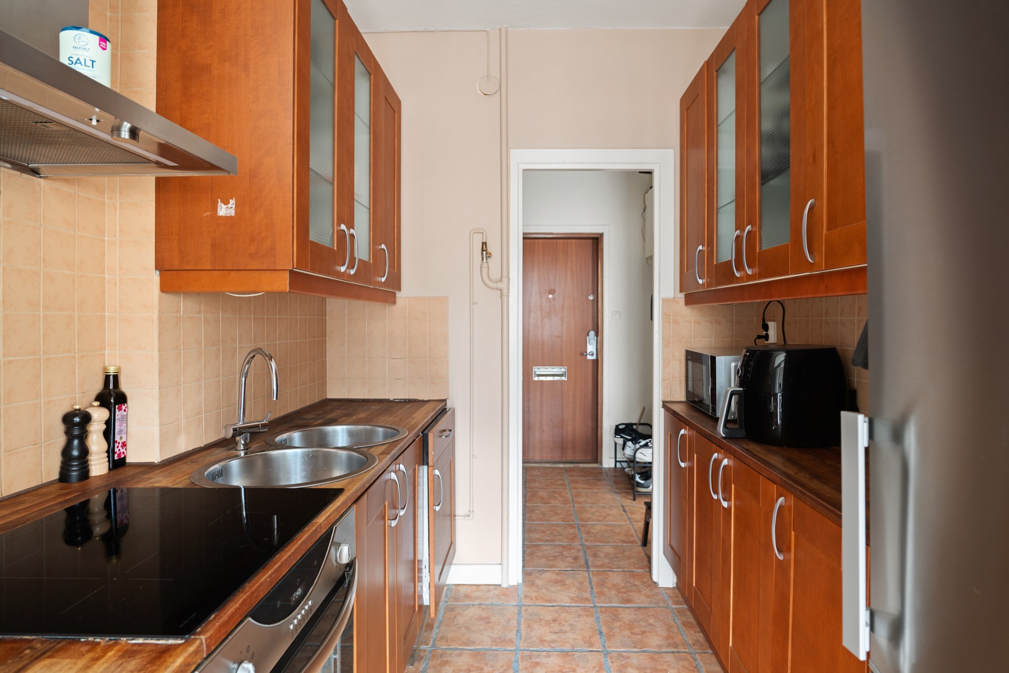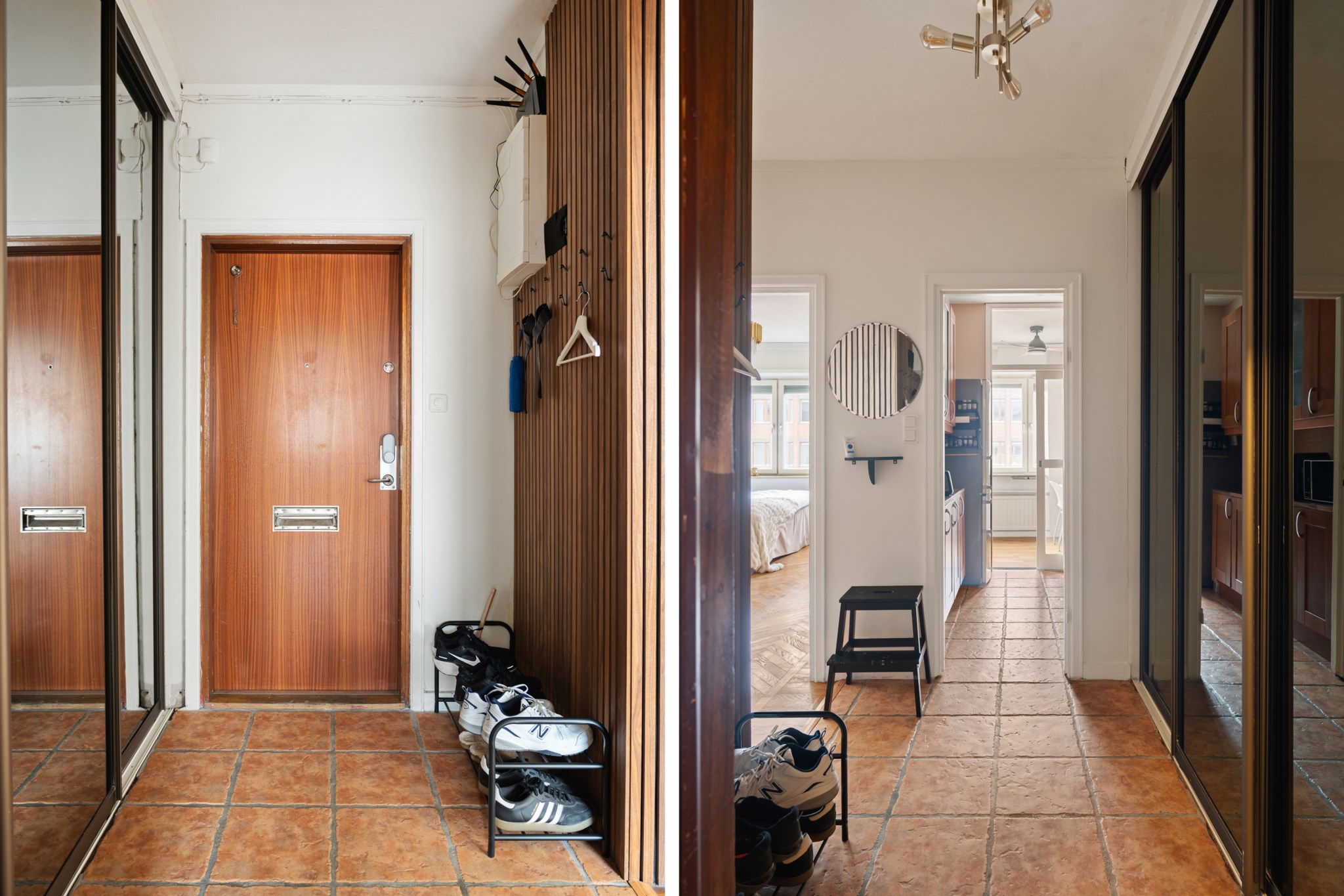 Förvaringsmöjligheterna är praktiskt lösta med garderober i hallen som ger ett funktionellt och organiserat första intryck.