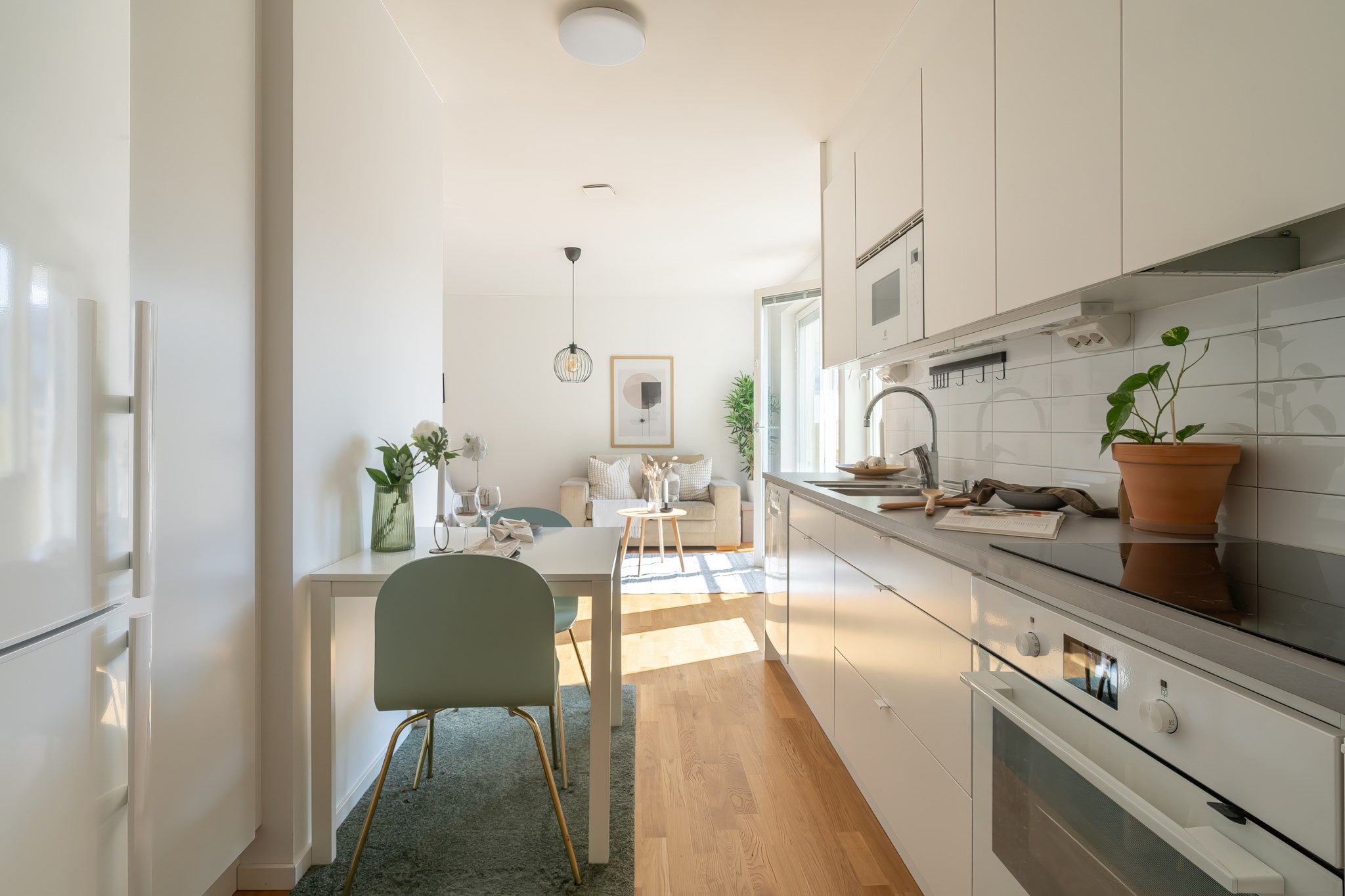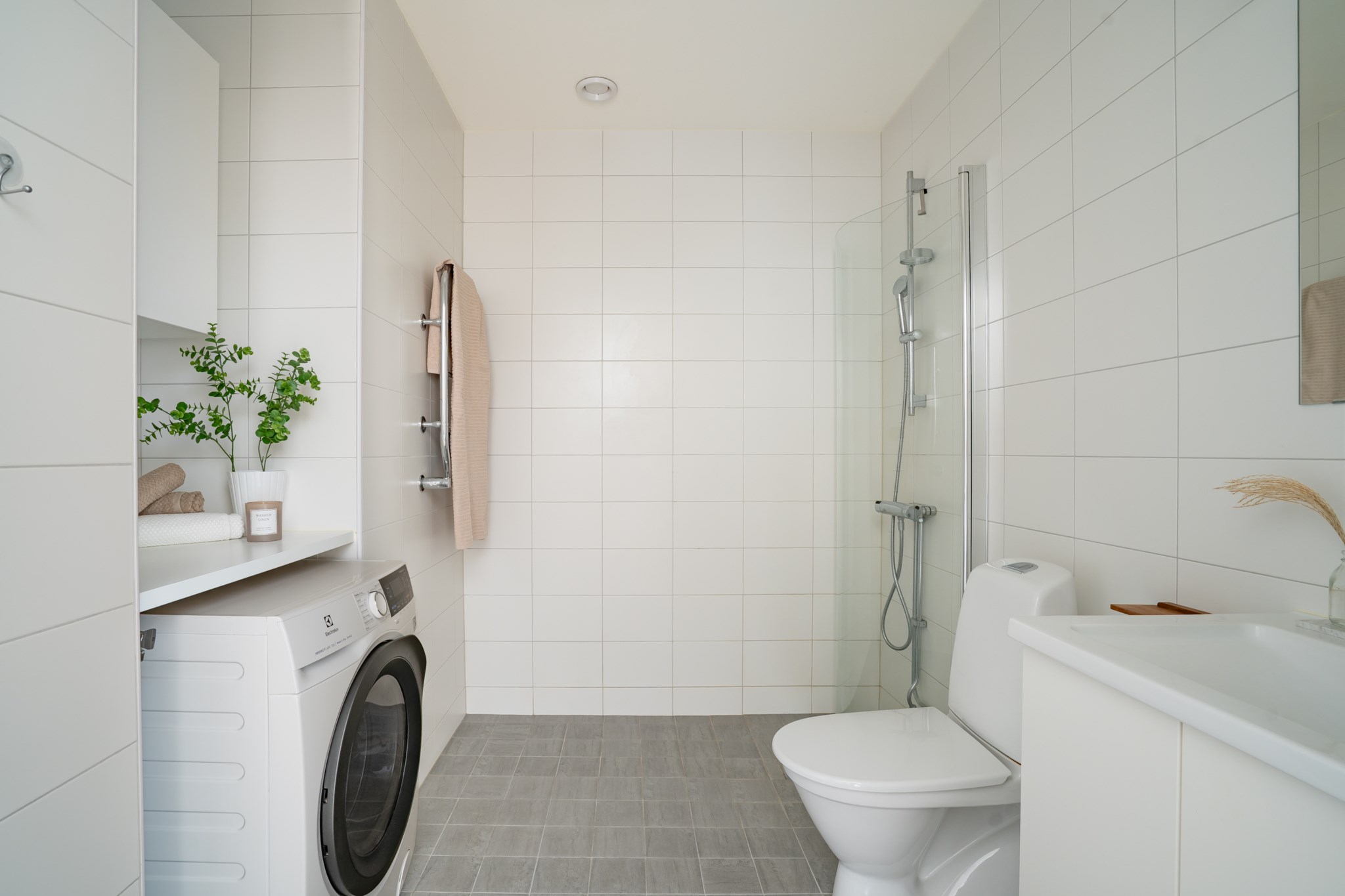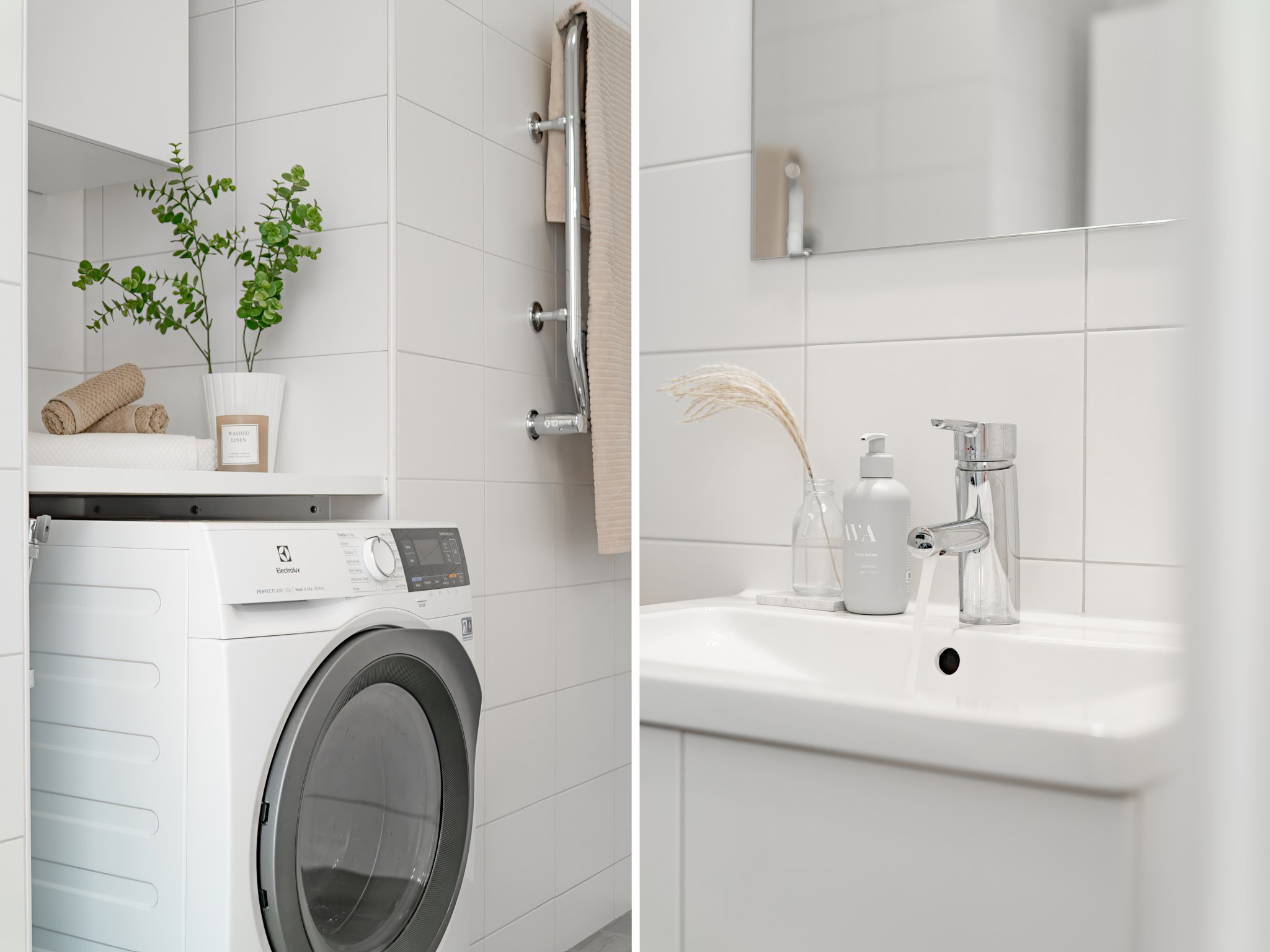 Köket är välutrustat med goda förvaringsmöjligheter och generösa arbetsytor för dig som gillar att laga mat. Här finns kyl/frys, induktionshäll, ugn, mikrovågsugn och diskmaskin. Badrummet är stilrent och utrustat med kombimaskin för extra bekvämlighet. Sammanfattningsvis erbjuder bostaden en social och genomtänkt planlösning, lättmöblerade ytor samt bra förvaring – inte minst i det inbyggda förrådet.