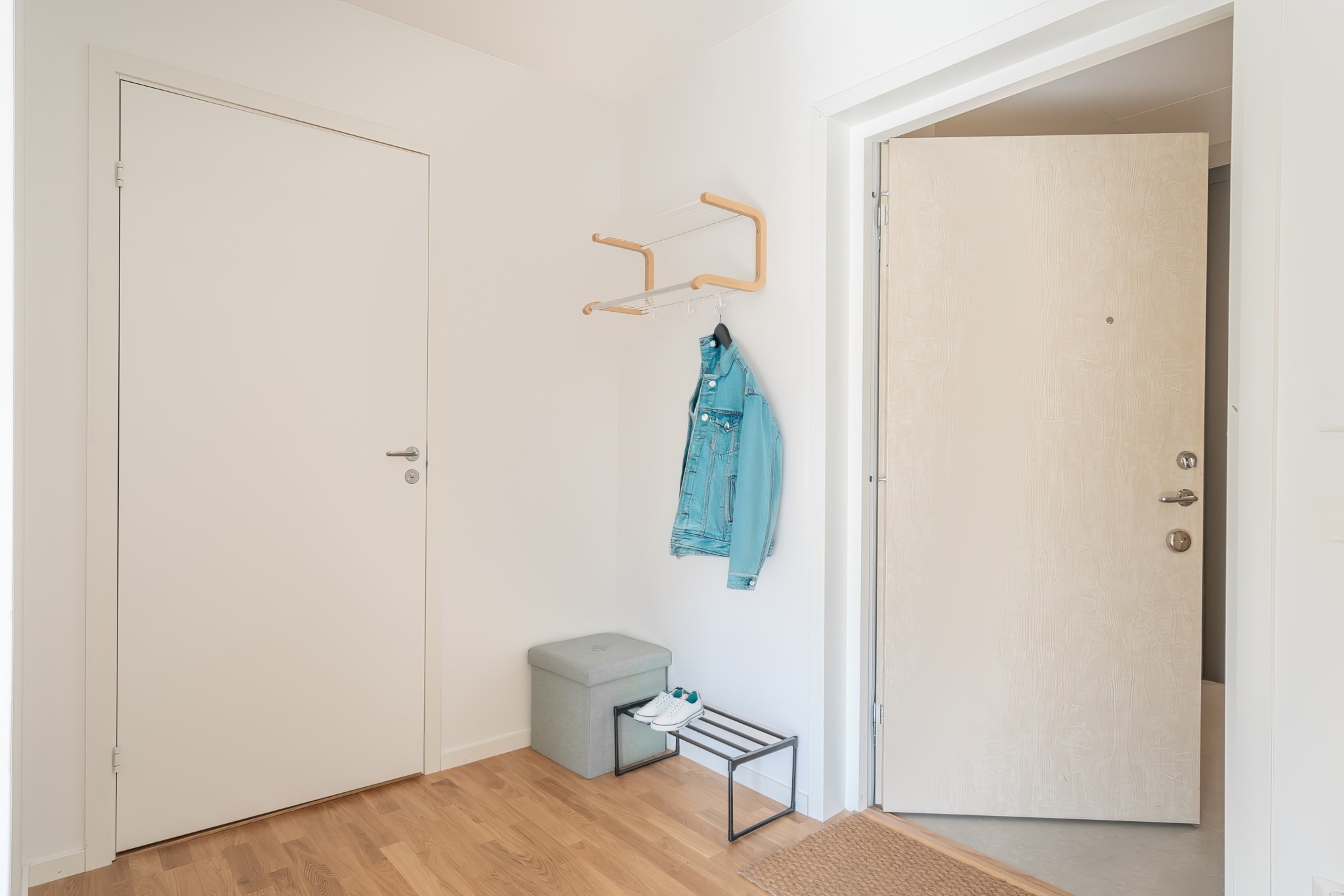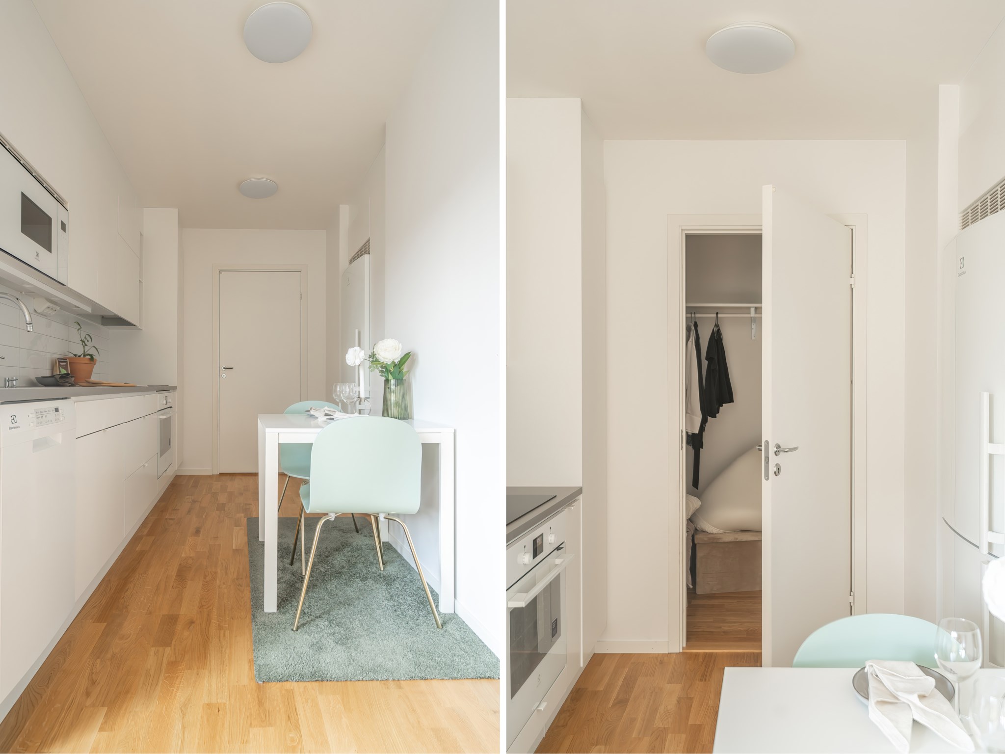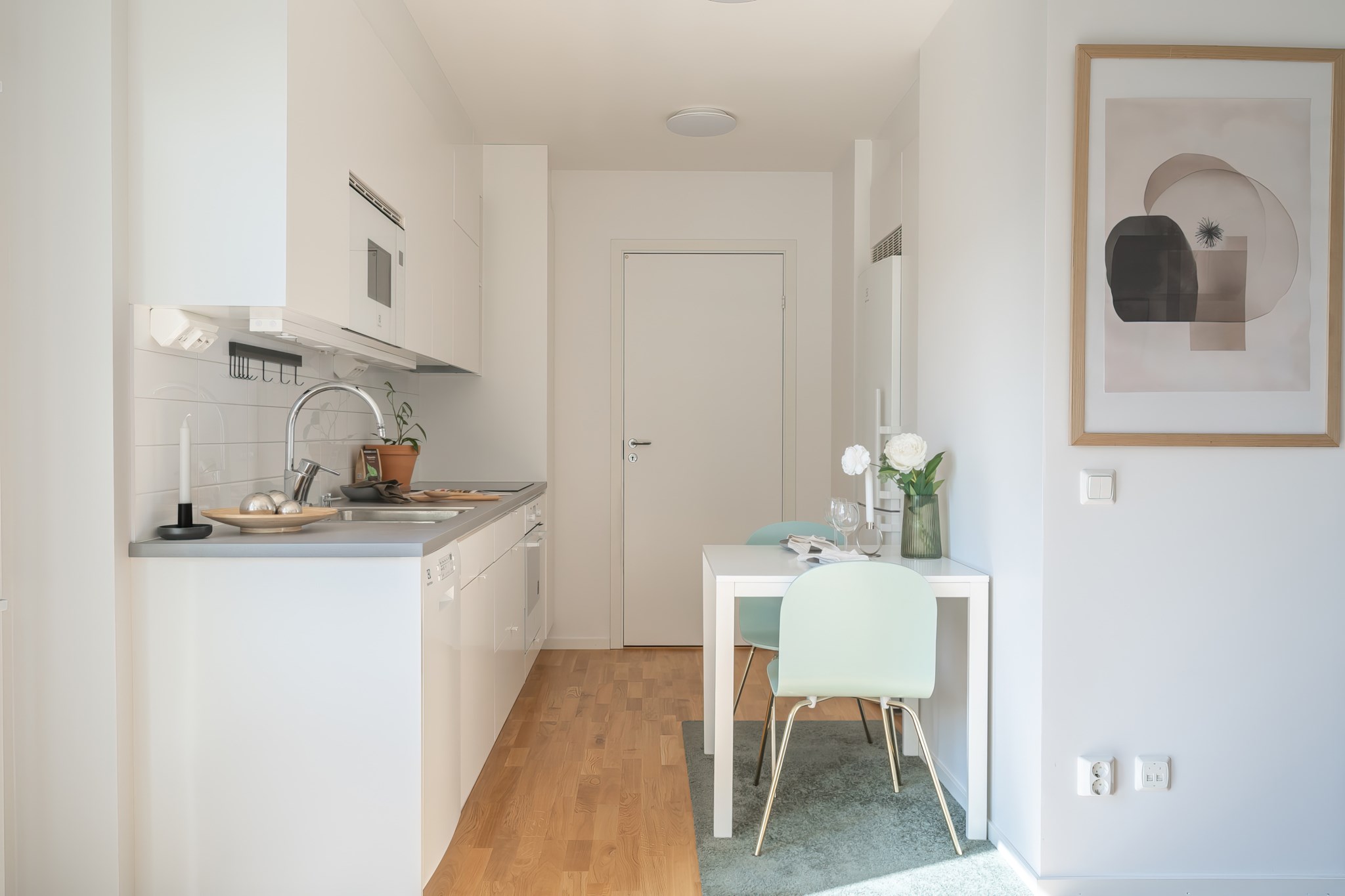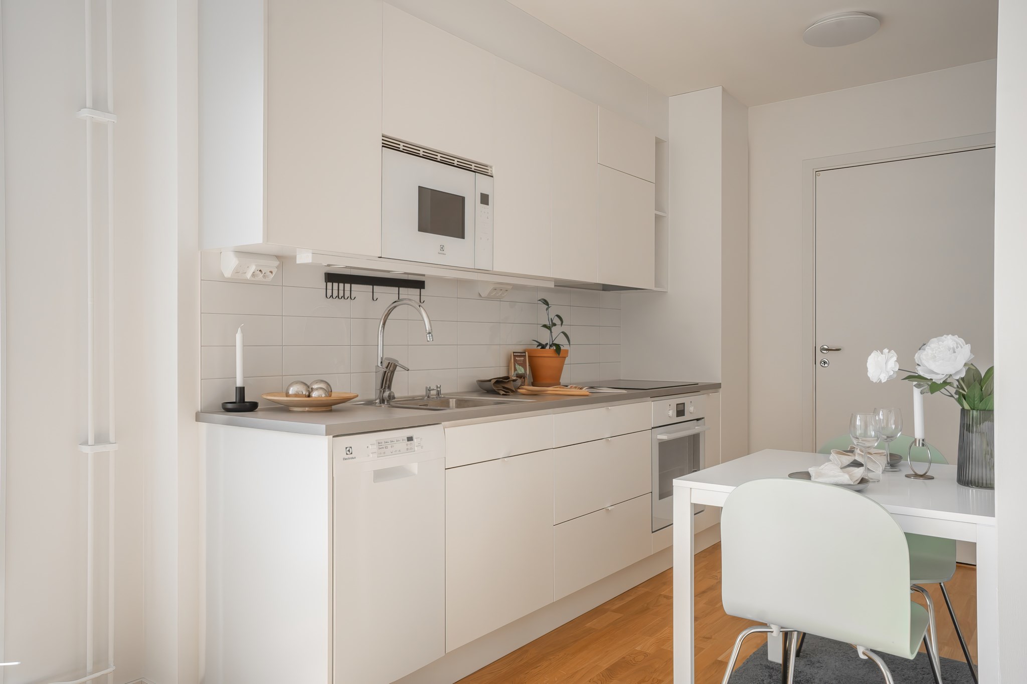 Köket är välutrustat med goda förvaringsmöjligheter och generösa arbetsytor för dig som gillar att laga mat. Här finns kyl/frys, induktionshäll, ugn, mikrovågsugn och diskmaskin. Badrummet är stilrent och utrustat med kombimaskin för extra bekvämlighet. Sammanfattningsvis erbjuder bostaden en social och genomtänkt planlösning, lättmöblerade ytor samt bra förvaring – inte minst i det inbyggda förrådet.