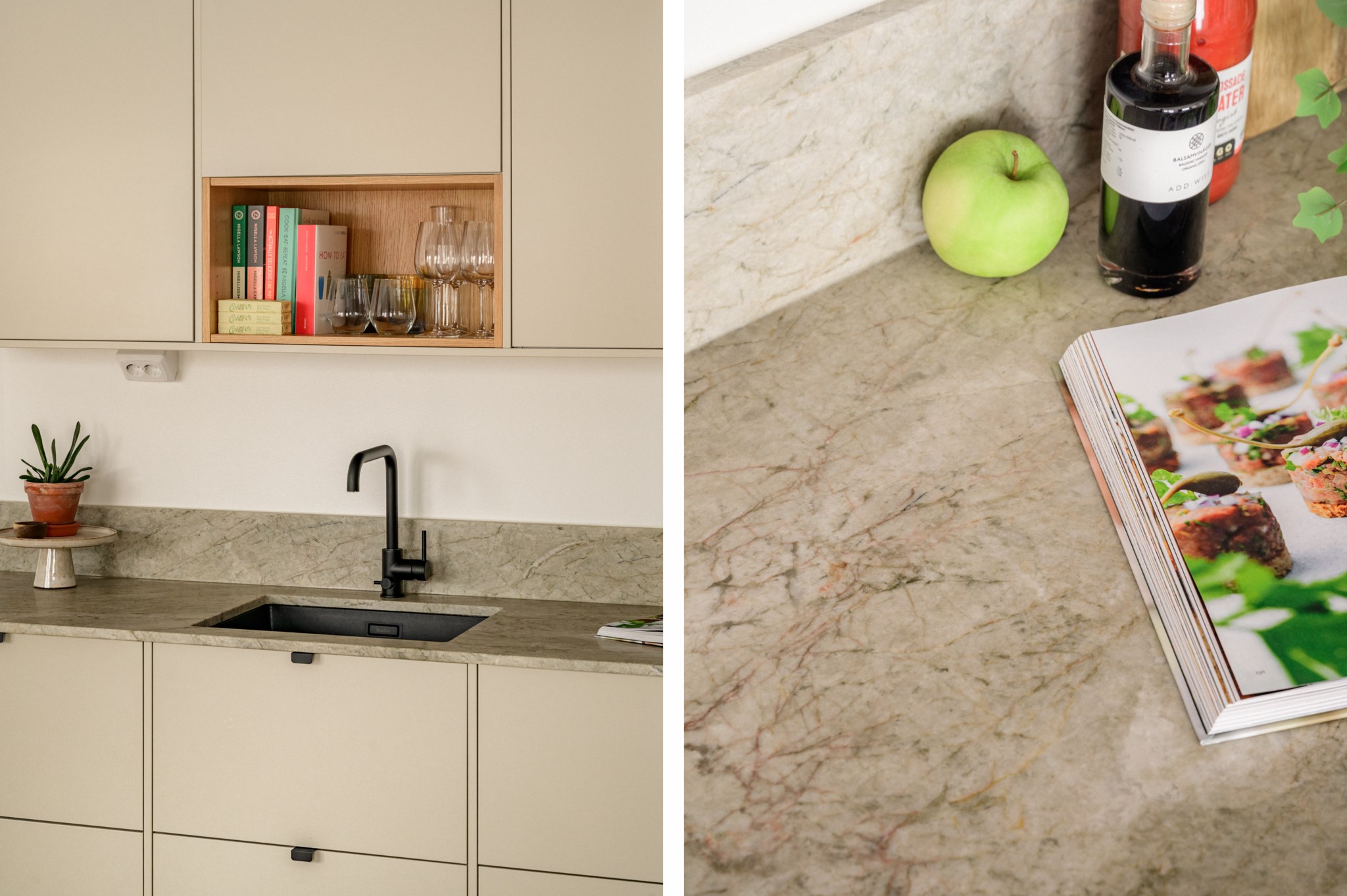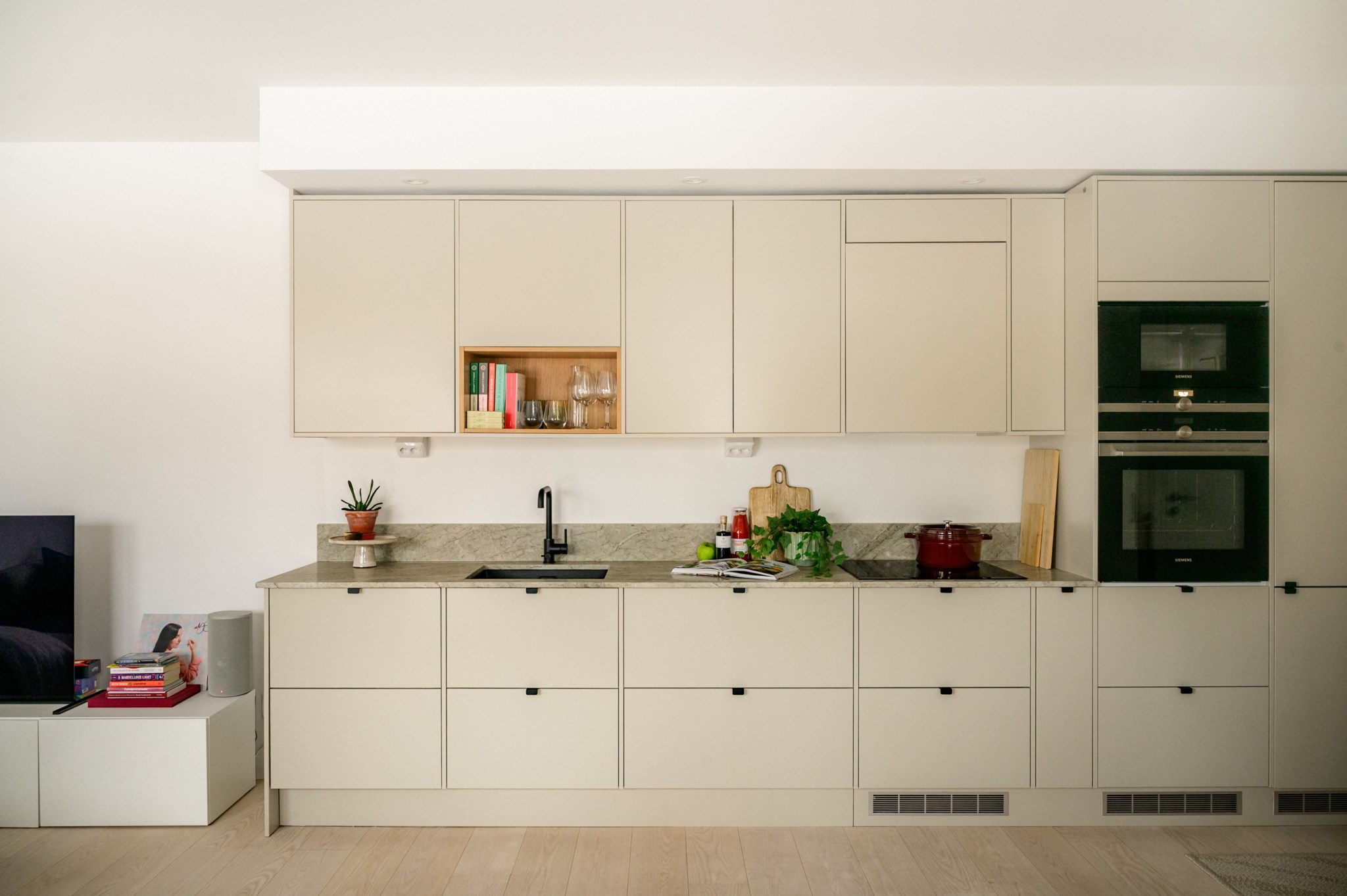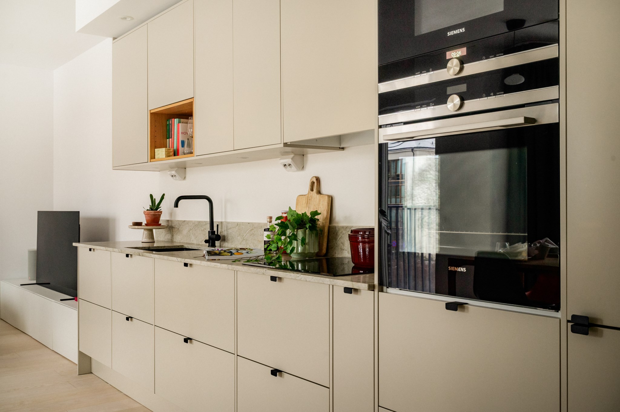 Köket är platsbyggt från Marbodal i sandkulör med integrerade vitvaror från Siemens. Bänkskiva och stänkskydd i kvartsit ger rummet både tyngd och elegans, medan detaljer i svart och inslag av ek tillför kontrast och värme. Ett kök som är utformat för såväl vardag som umgänge.