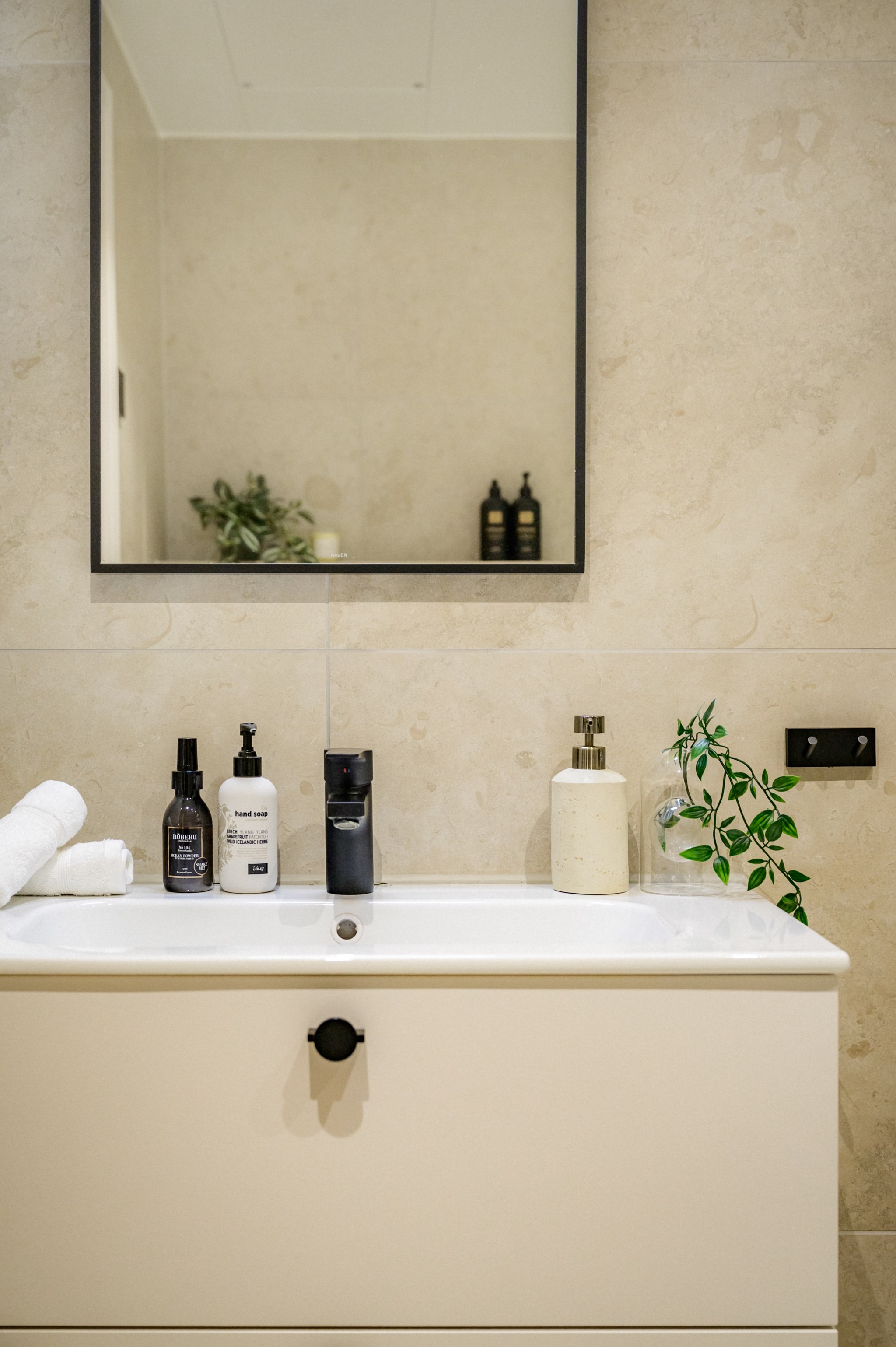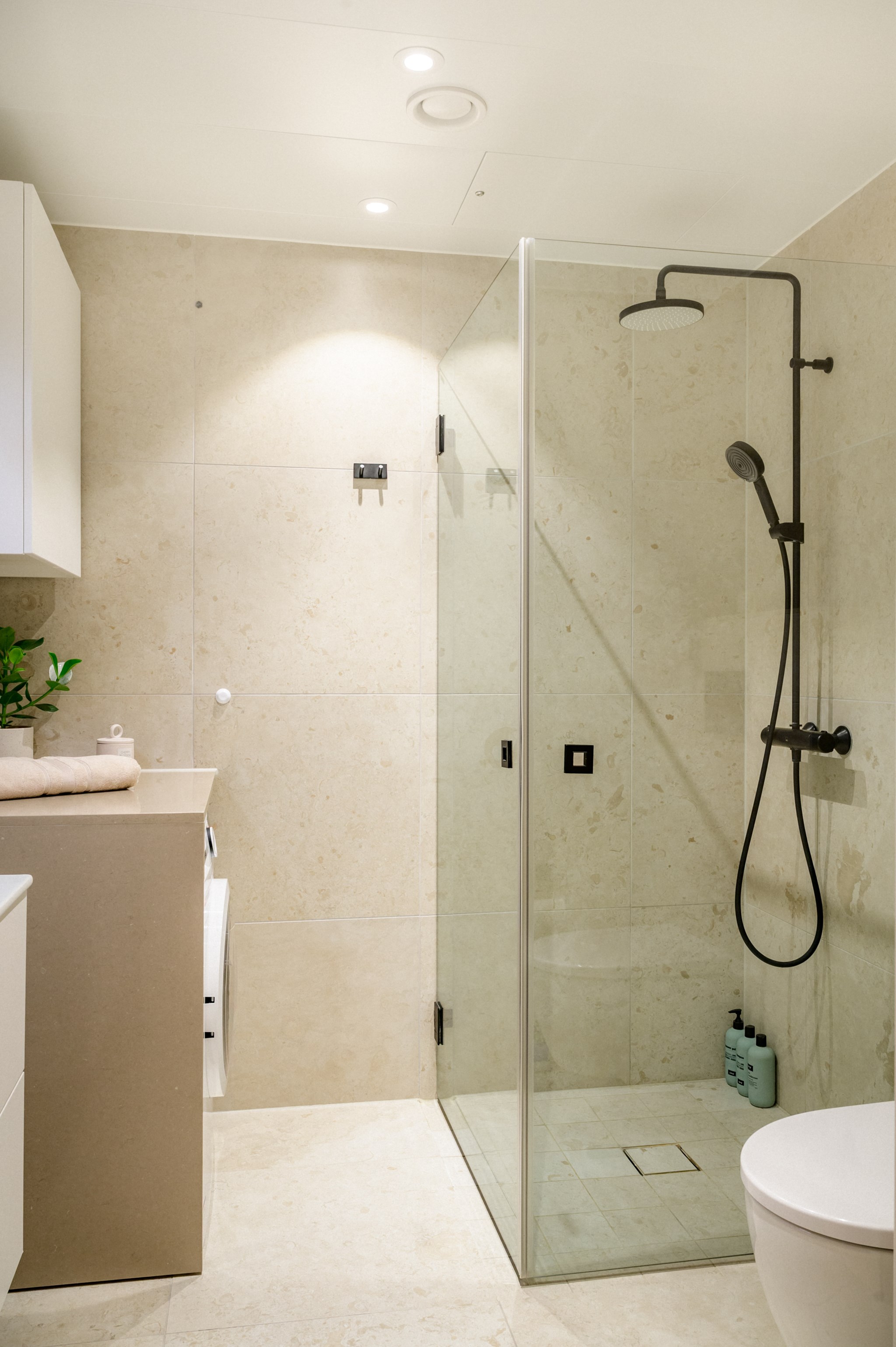Badrummet är stilrent och påkostat med granitkeramik i naturstensinspirerade toner, dusch med glasvägg, takdusch och noggrant utvalda detaljer. Helheten är modern och tidlös med tydlig känsla för kvalitet.