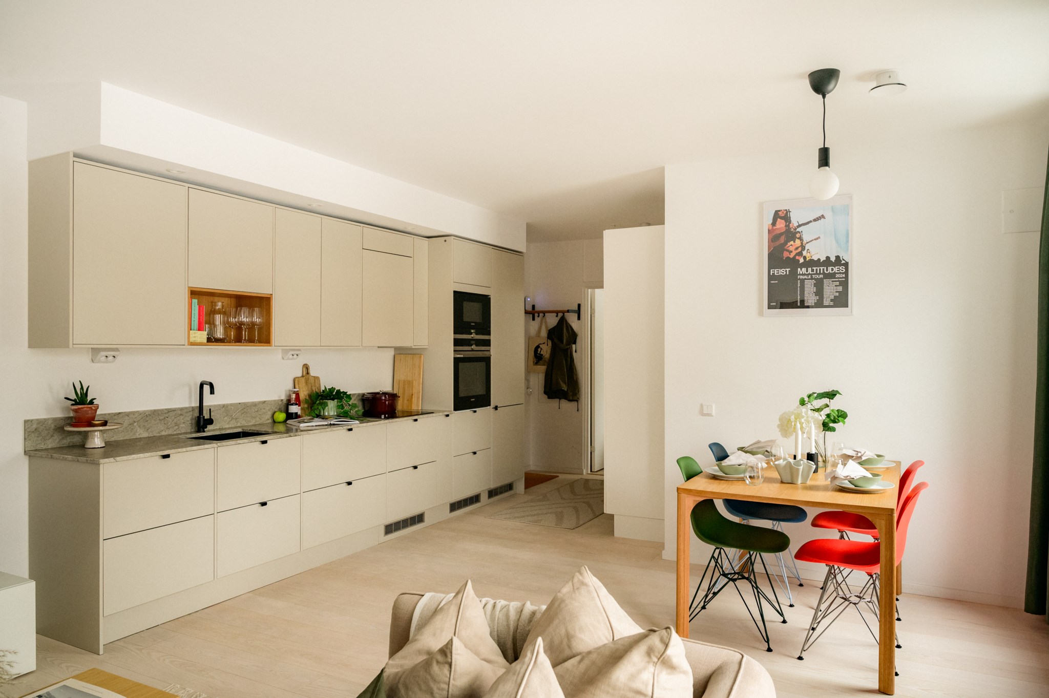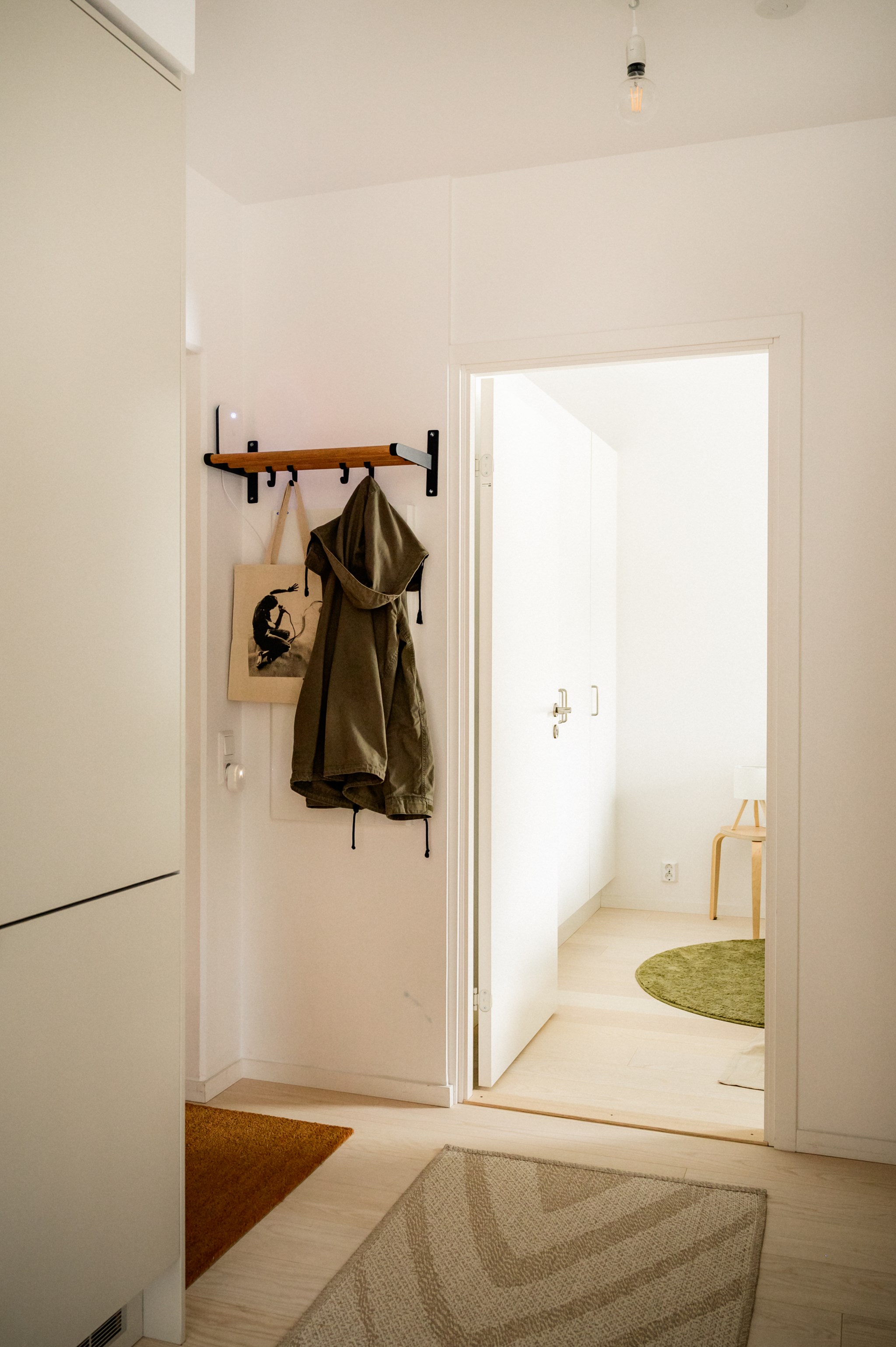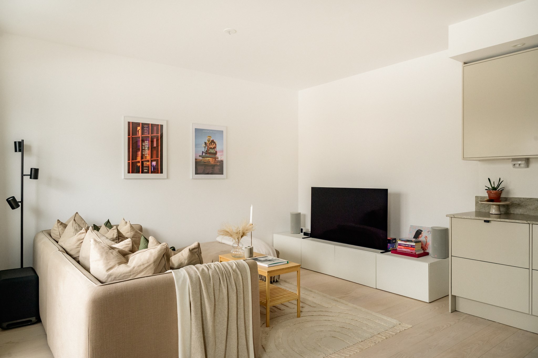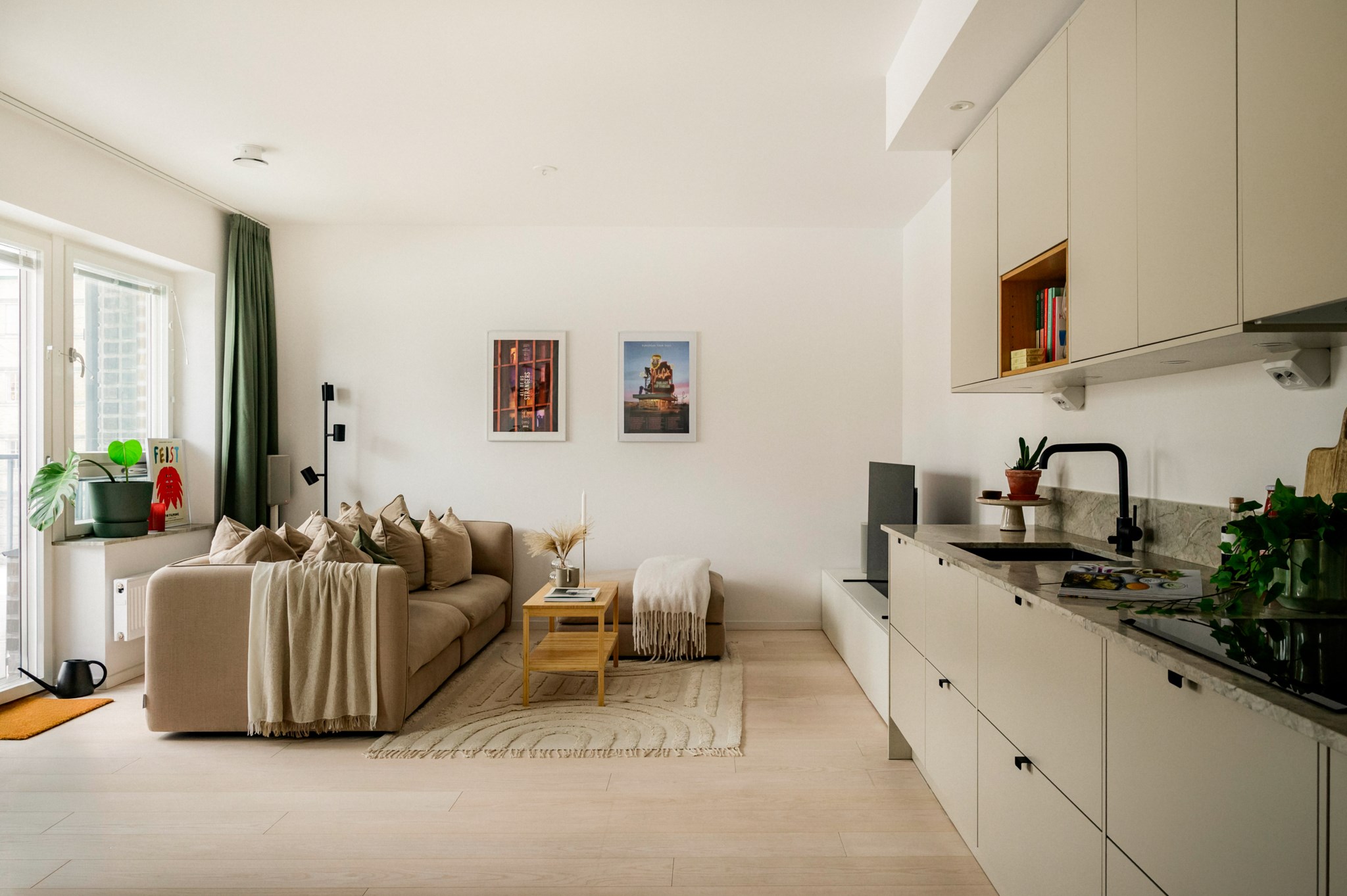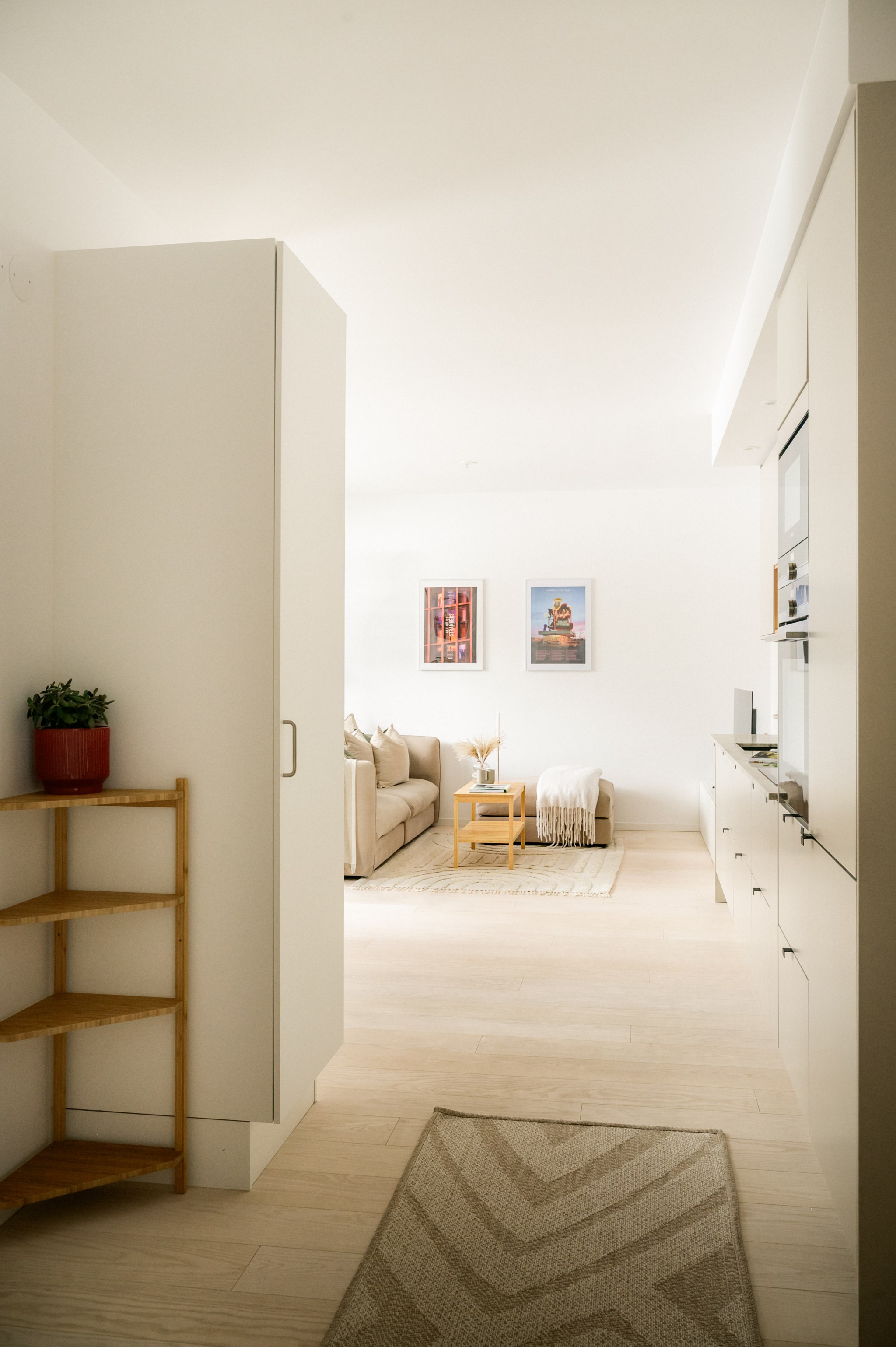 Interiören präglas av lugn och precision. Ljusa, målade betongytor möter askparkett och skapar ett sobert uttryck som löper genom hela bostaden. Planlösningen är öppen men kontrollerad, med kök och vardagsrum i naturlig samklang och ett generöst ljusinsläpp som förstärker rymden.