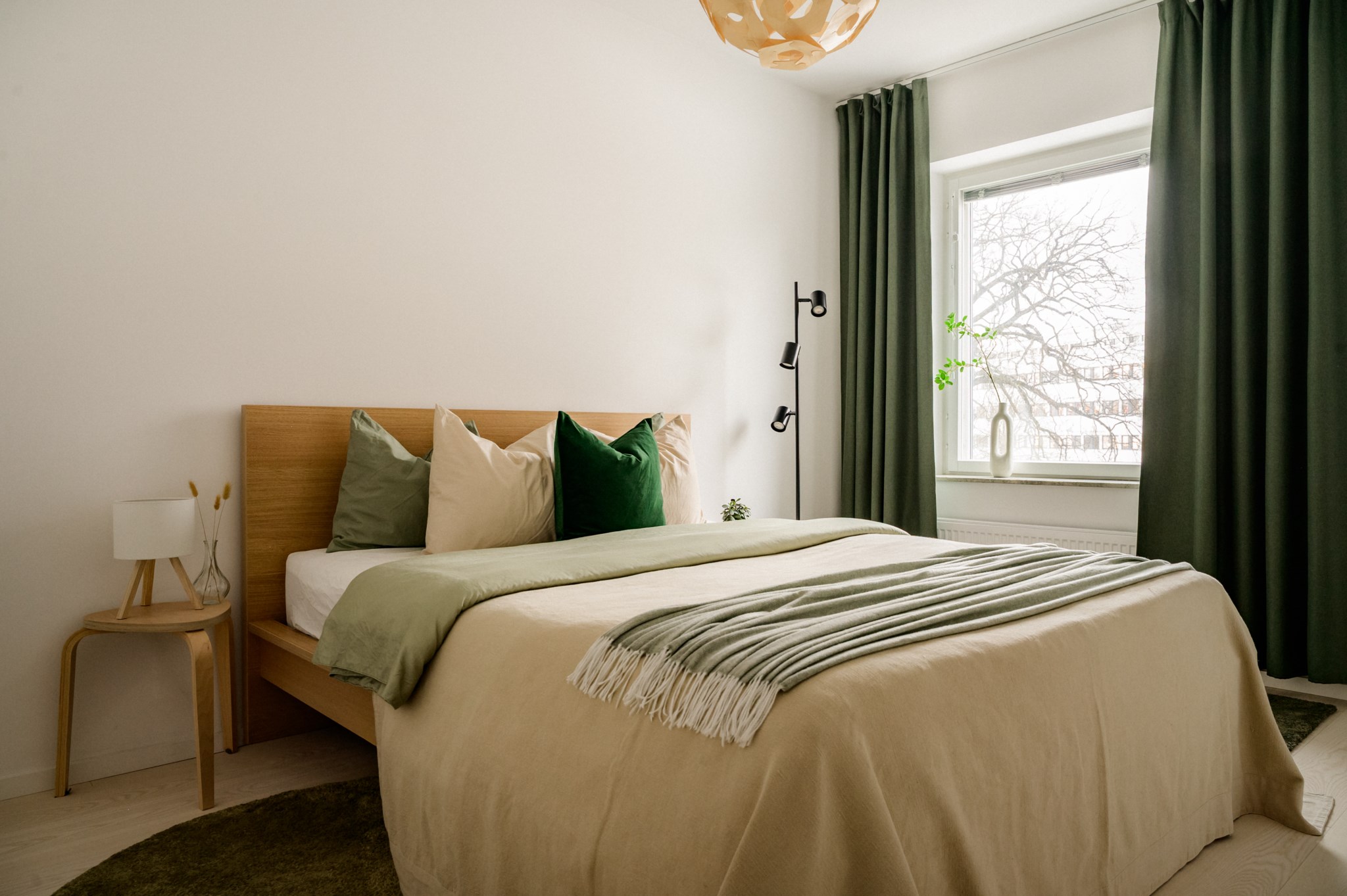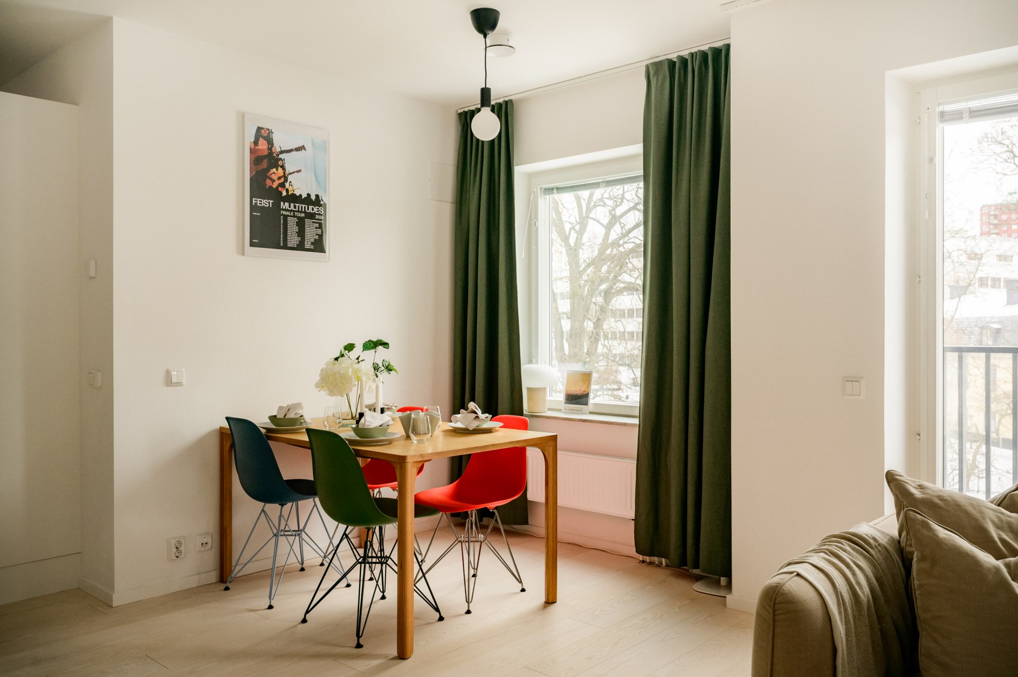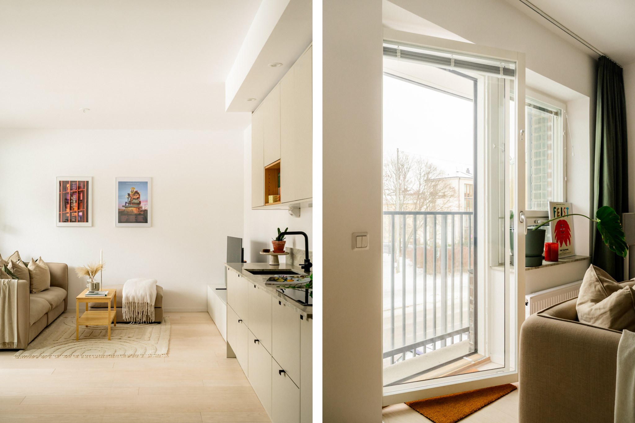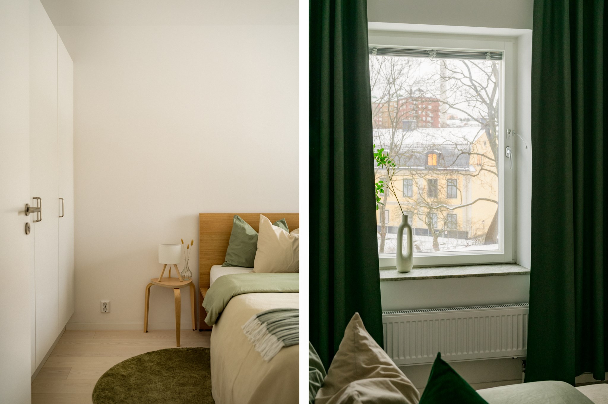 Vardagsrummet erbjuder plats för både soffgrupp och matplats i en lugn och balanserad miljö. Sovrummet är avskilt och rofyllt med god förvaring och en harmonisk färgskala som bidrar till en avkopplande känsla.
