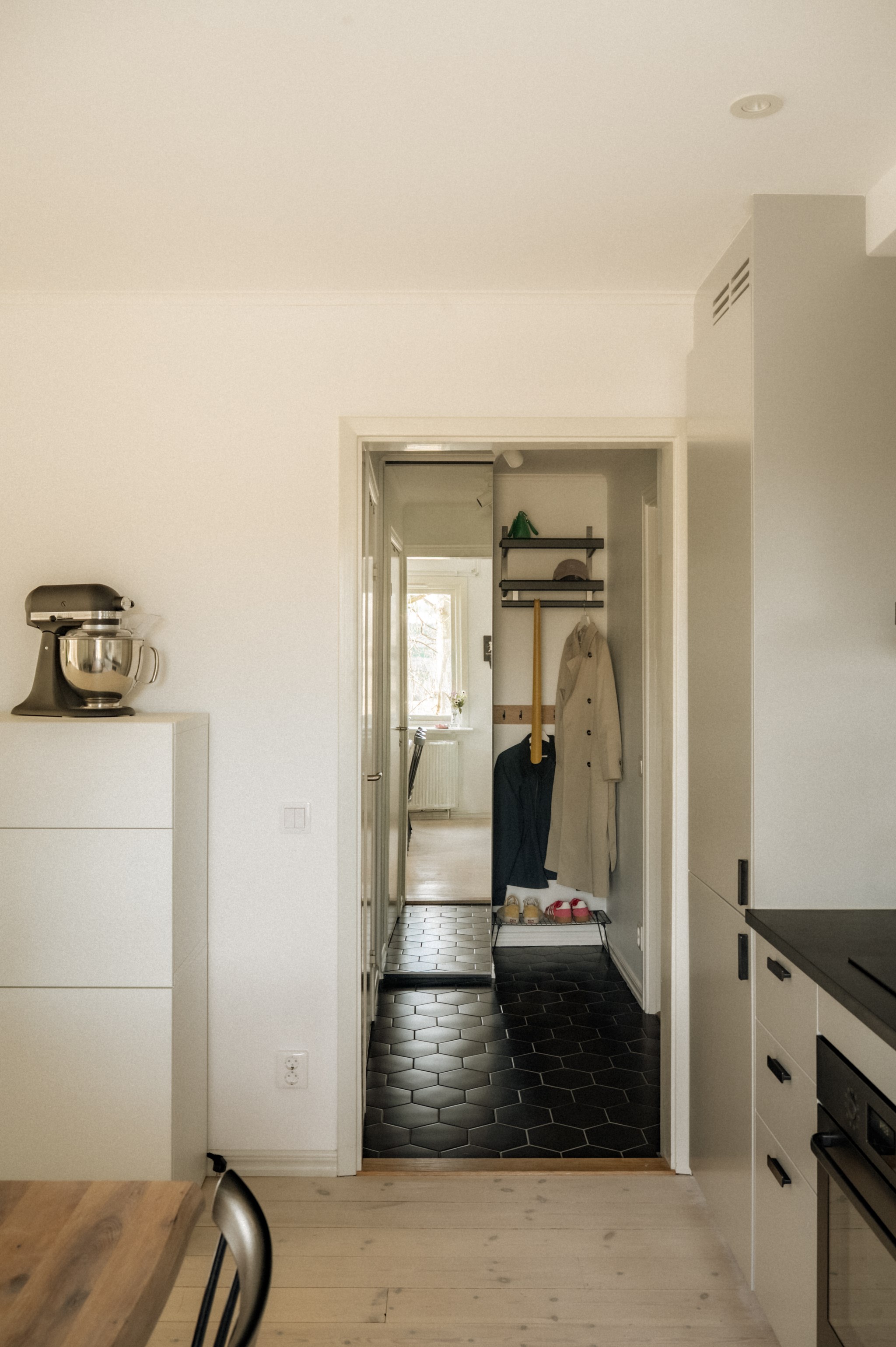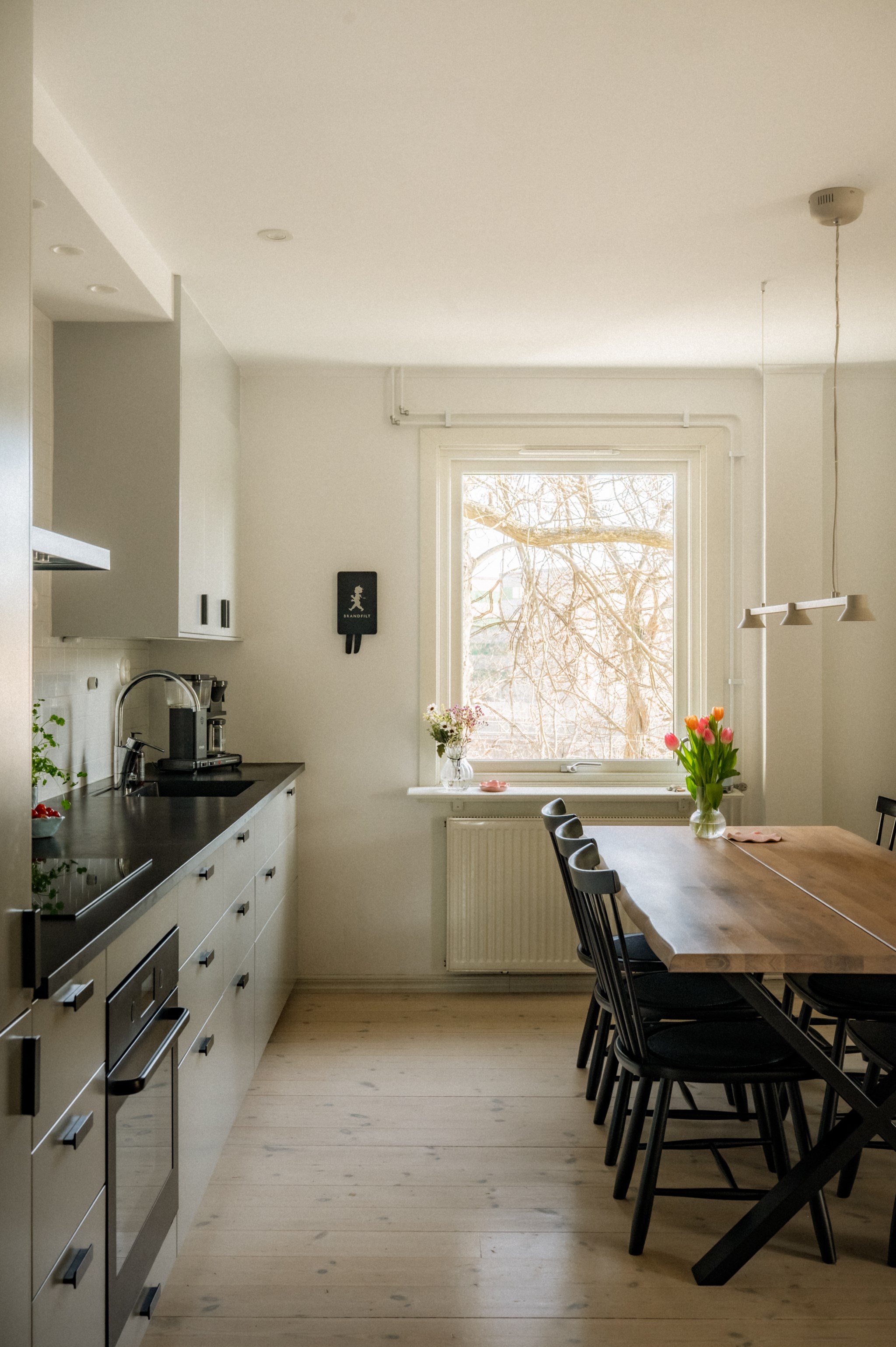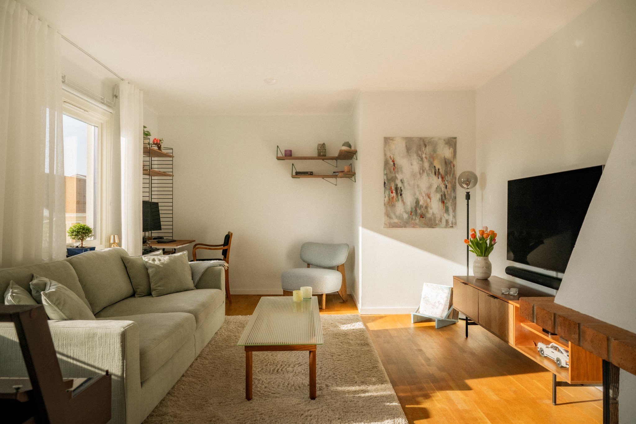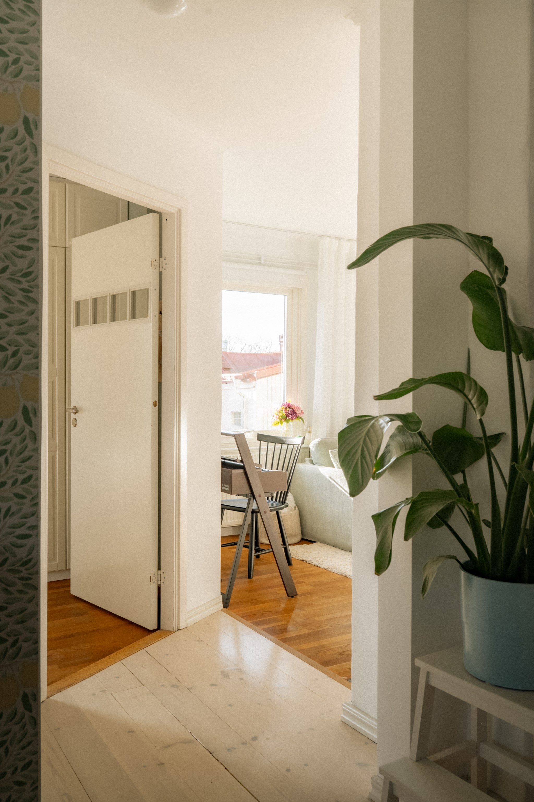 Redan när du kliver in genom dörren möts du av ett hem där ljuset får spela huvudrollen. Fönsterpartierna släpper in rikligt med dagsljus som förstärker bostadens lugna färgskala och skapar en trivsam helhet genom hela bostaden.