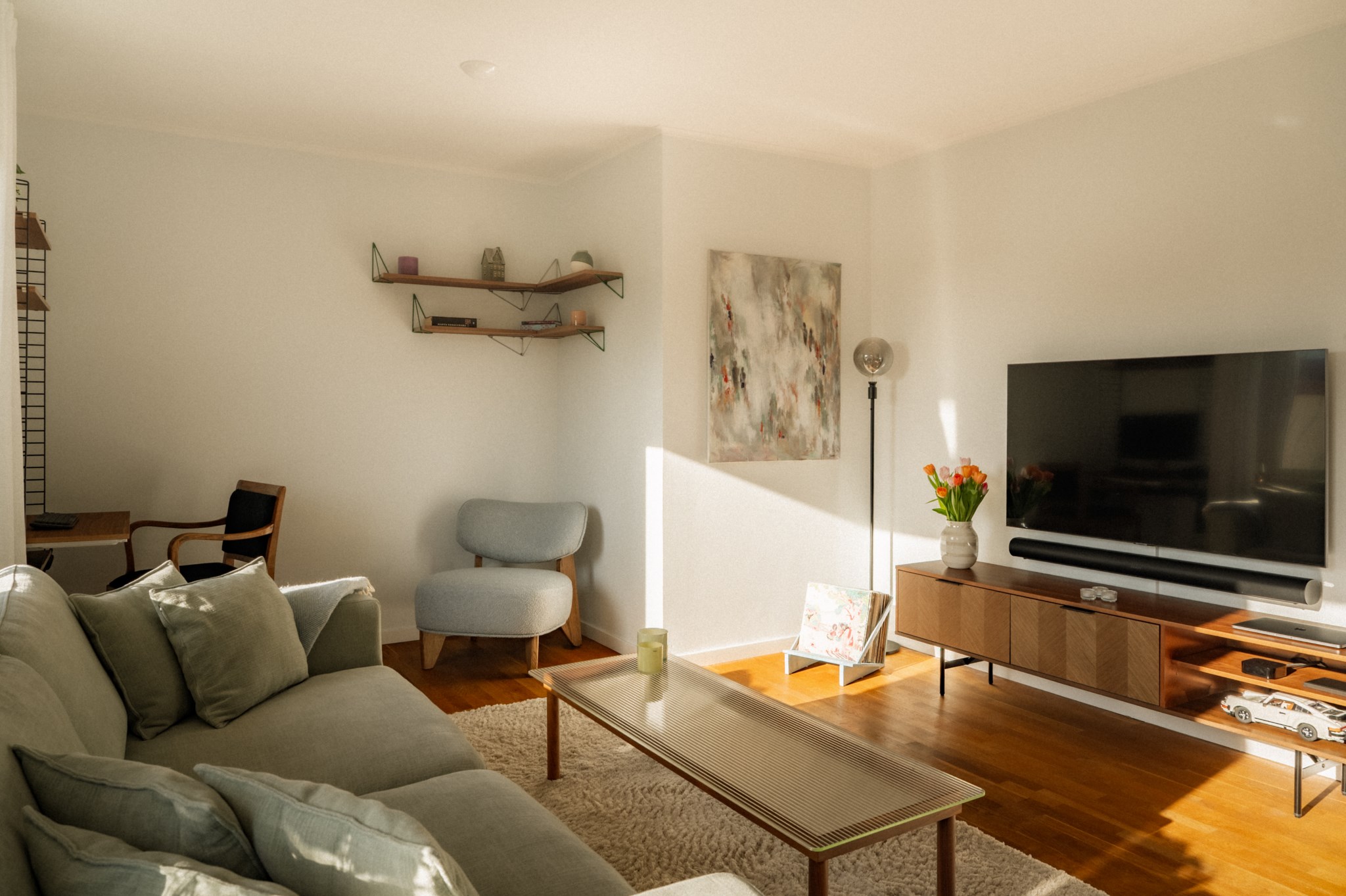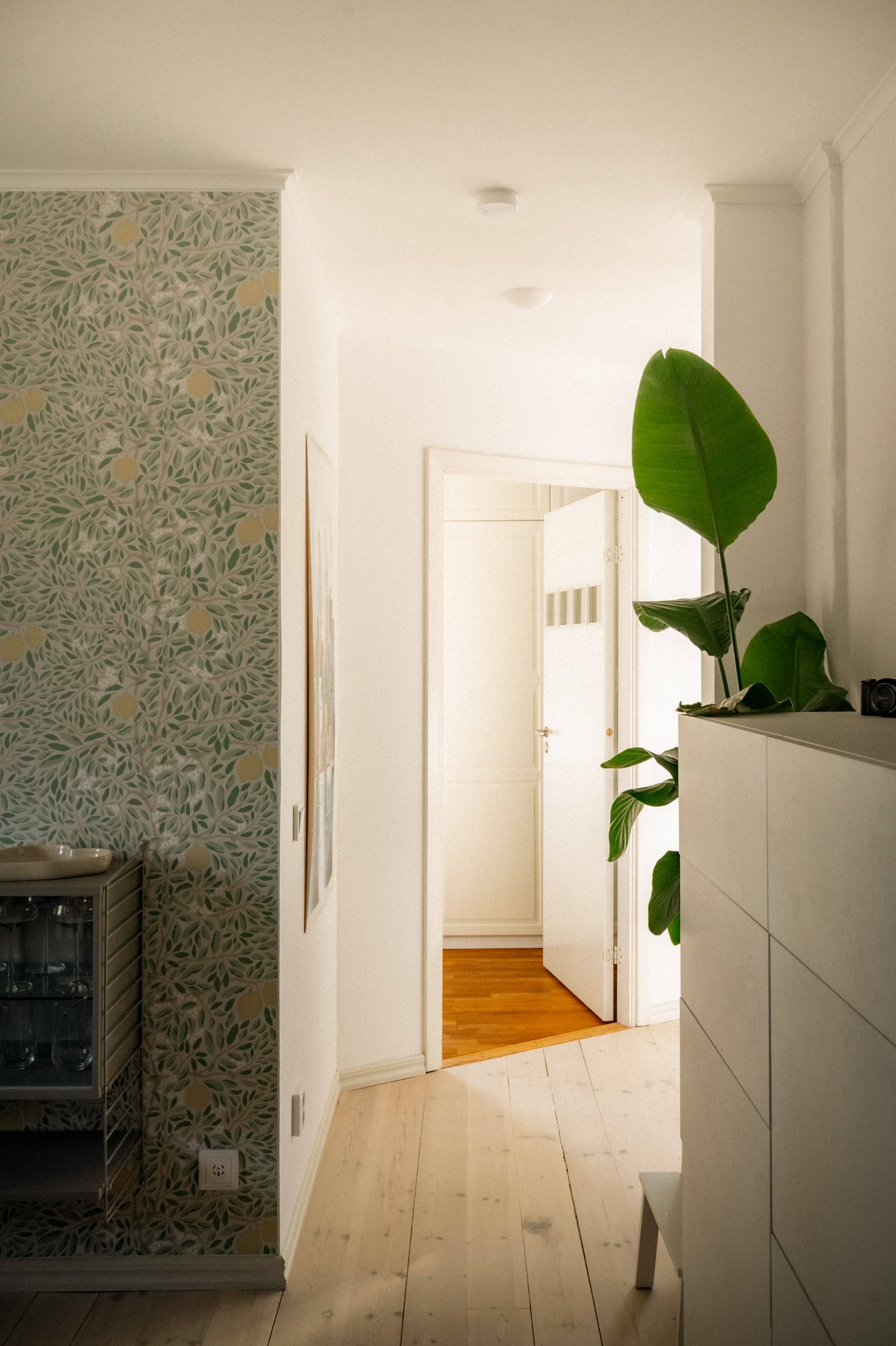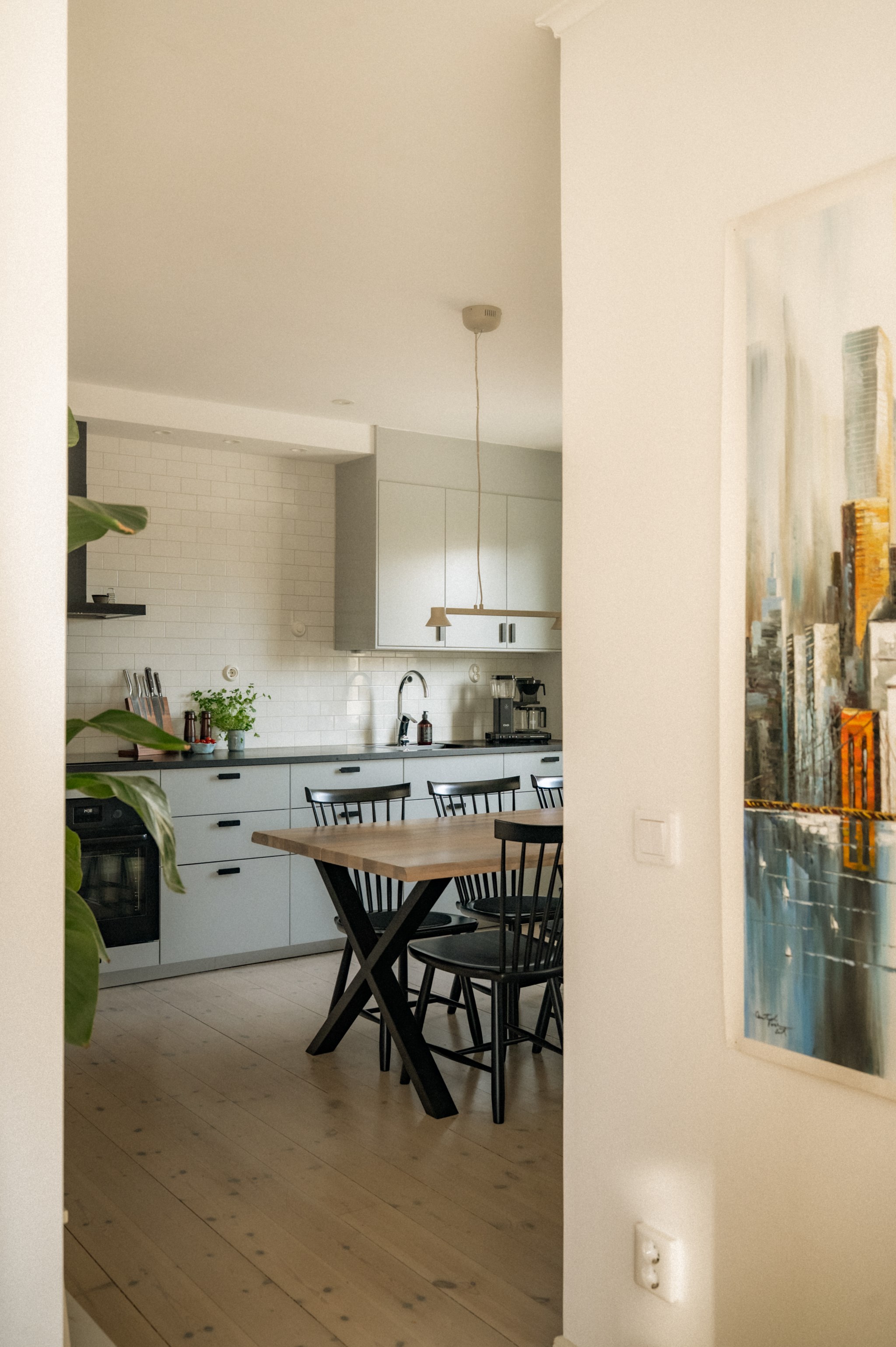Redan när du kliver in genom dörren möts du av ett hem där ljuset får spela huvudrollen. Fönsterpartierna släpper in rikligt med dagsljus som förstärker bostadens lugna färgskala och skapar en trivsam helhet genom hela bostaden.