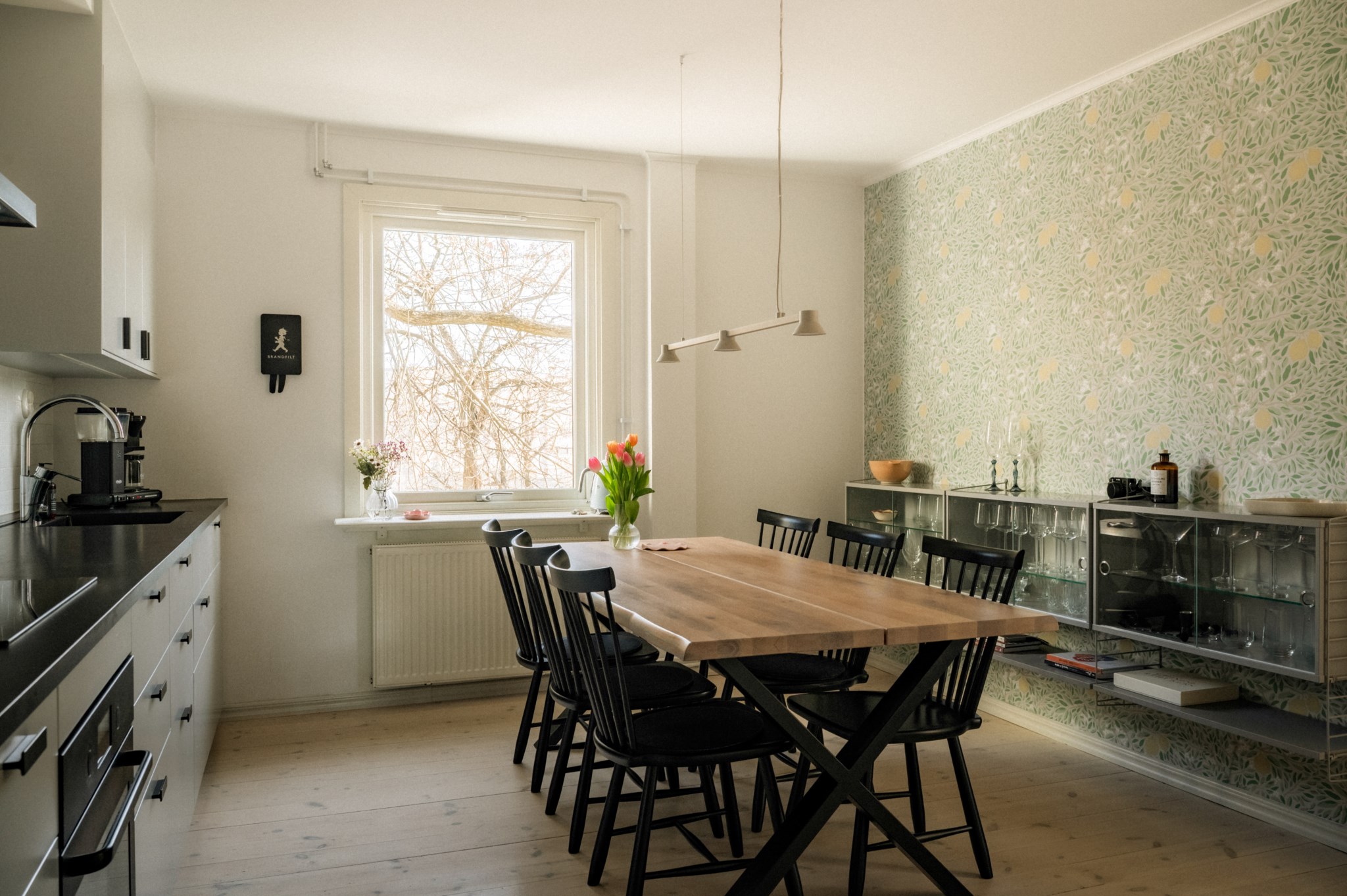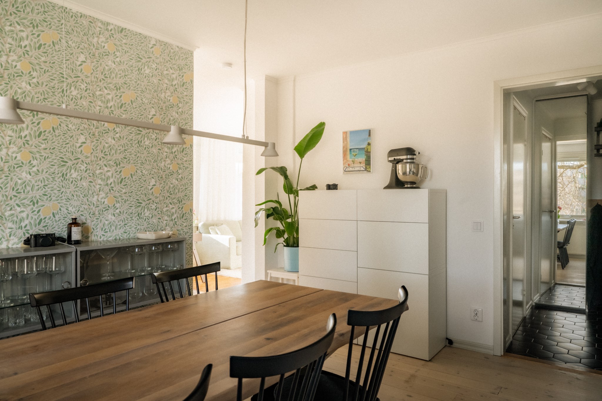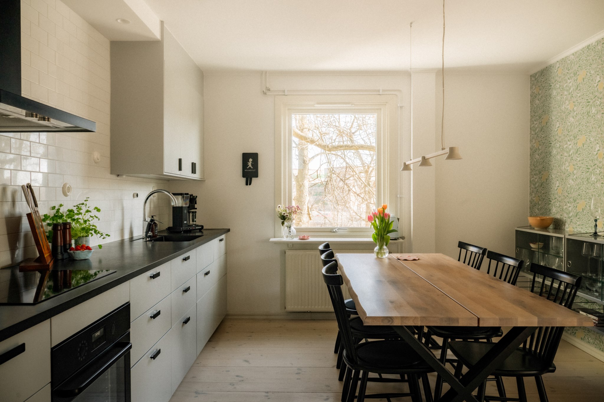 Köket är nyrenoverat och utformat med både funktion och estetik i fokus. Här möts du av goda arbetsytor, smart förvaring och en planlösning som gör matlagningen både enkel och inspirerande. Den harmoniska tapeten och de sobra färgtonerna ger rummet en varm och elegant karaktär – en miljö som känns lika trivsam under vardagens snabba middagar som under längre middagar i gott sällskap. Här finns dessutom plats för ett generöst matbord där familj och vänner gärna samlas.