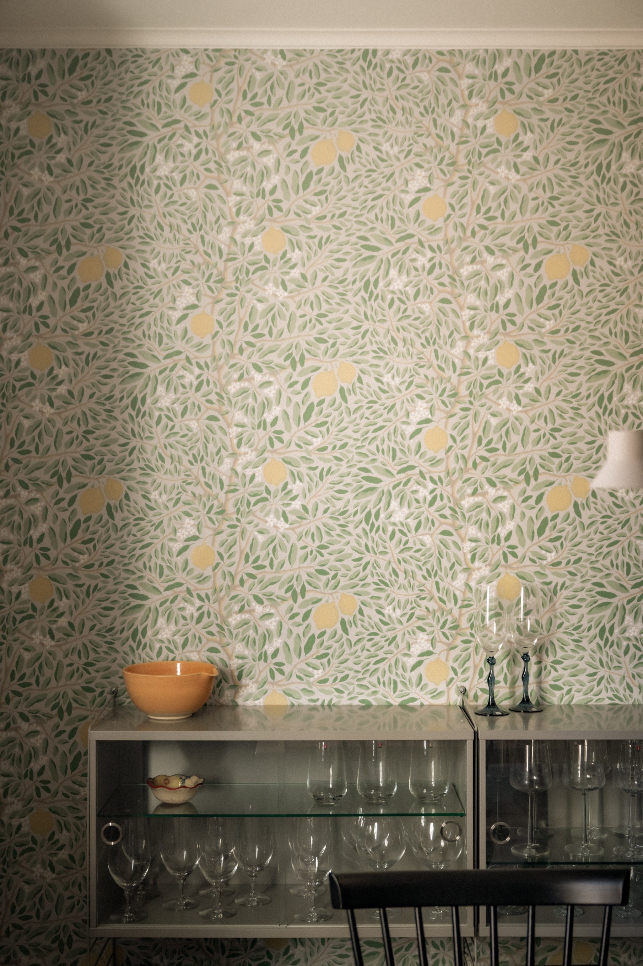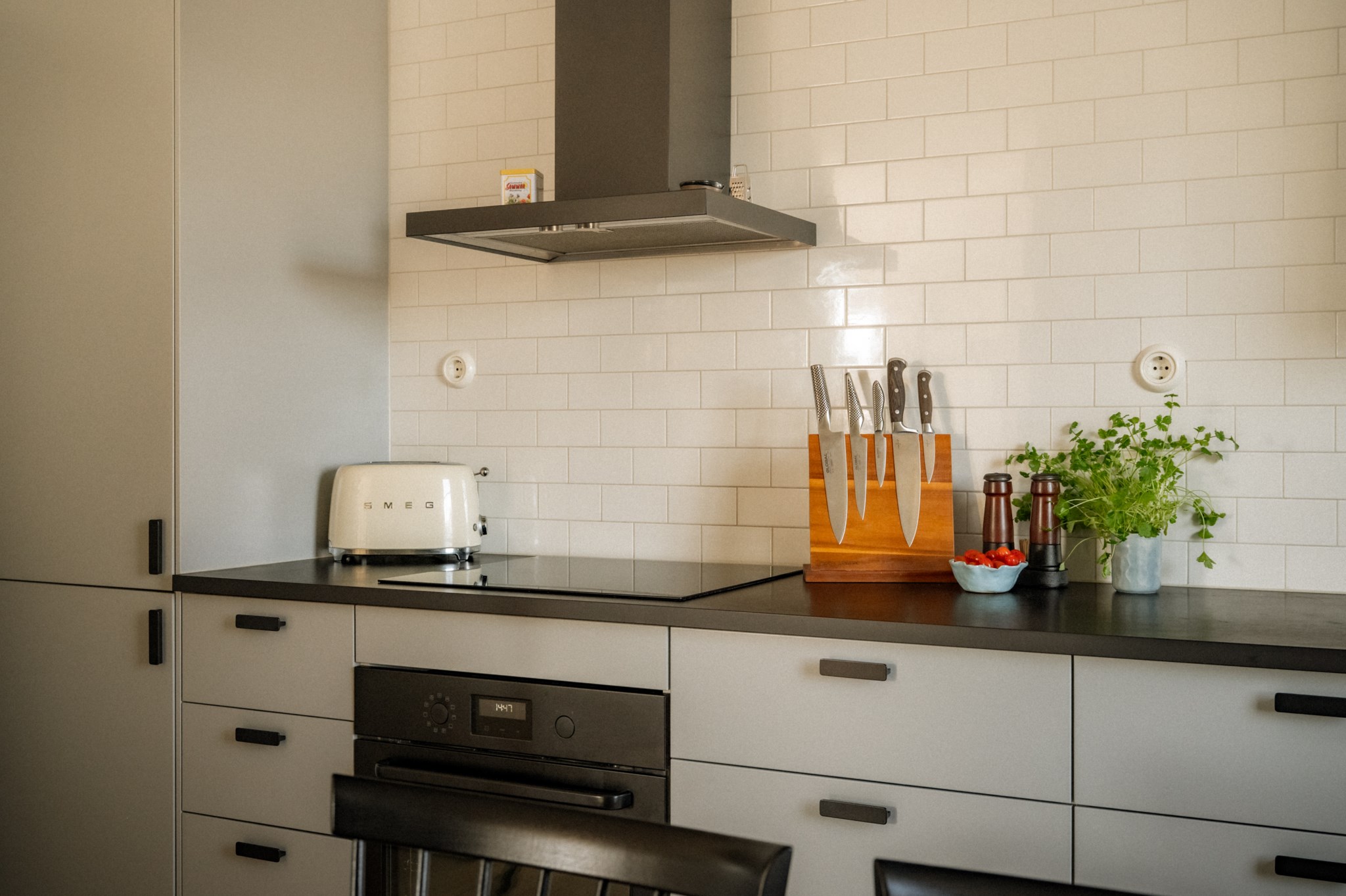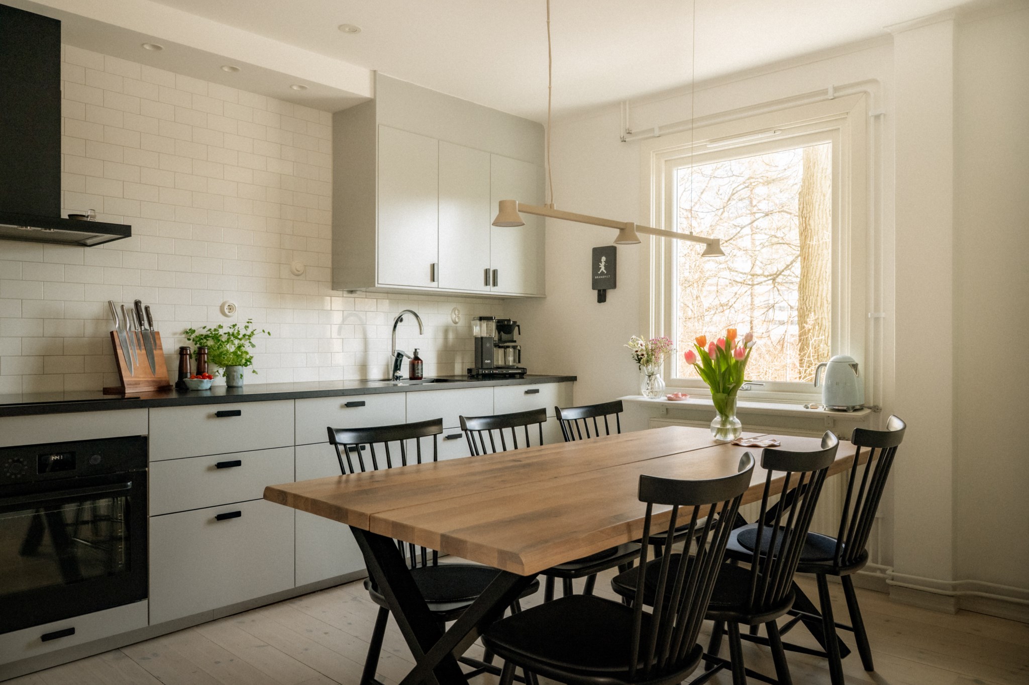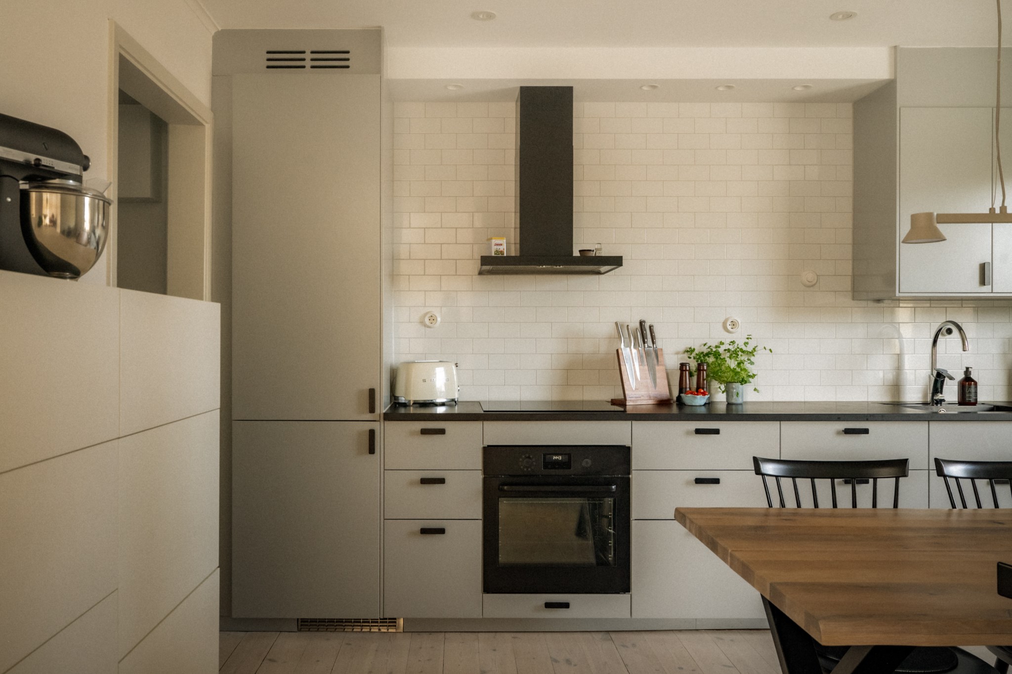 Köket är nyrenoverat och utformat med både funktion och estetik i fokus. Här möts du av goda arbetsytor, smart förvaring och en planlösning som gör matlagningen både enkel och inspirerande. Den harmoniska tapeten och de sobra färgtonerna ger rummet en varm och elegant karaktär – en miljö som känns lika trivsam under vardagens snabba middagar som under längre middagar i gott sällskap. Här finns dessutom plats för ett generöst matbord där familj och vänner gärna samlas.