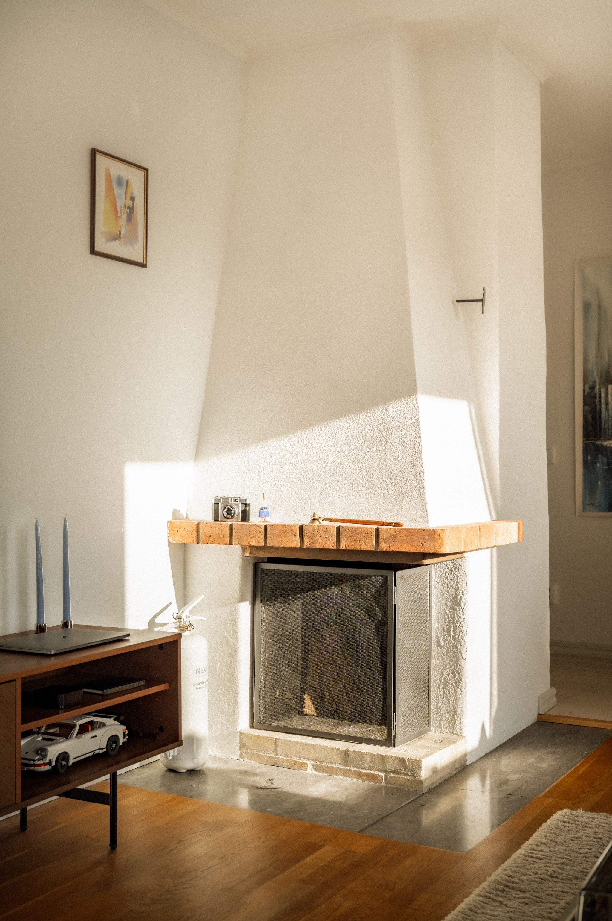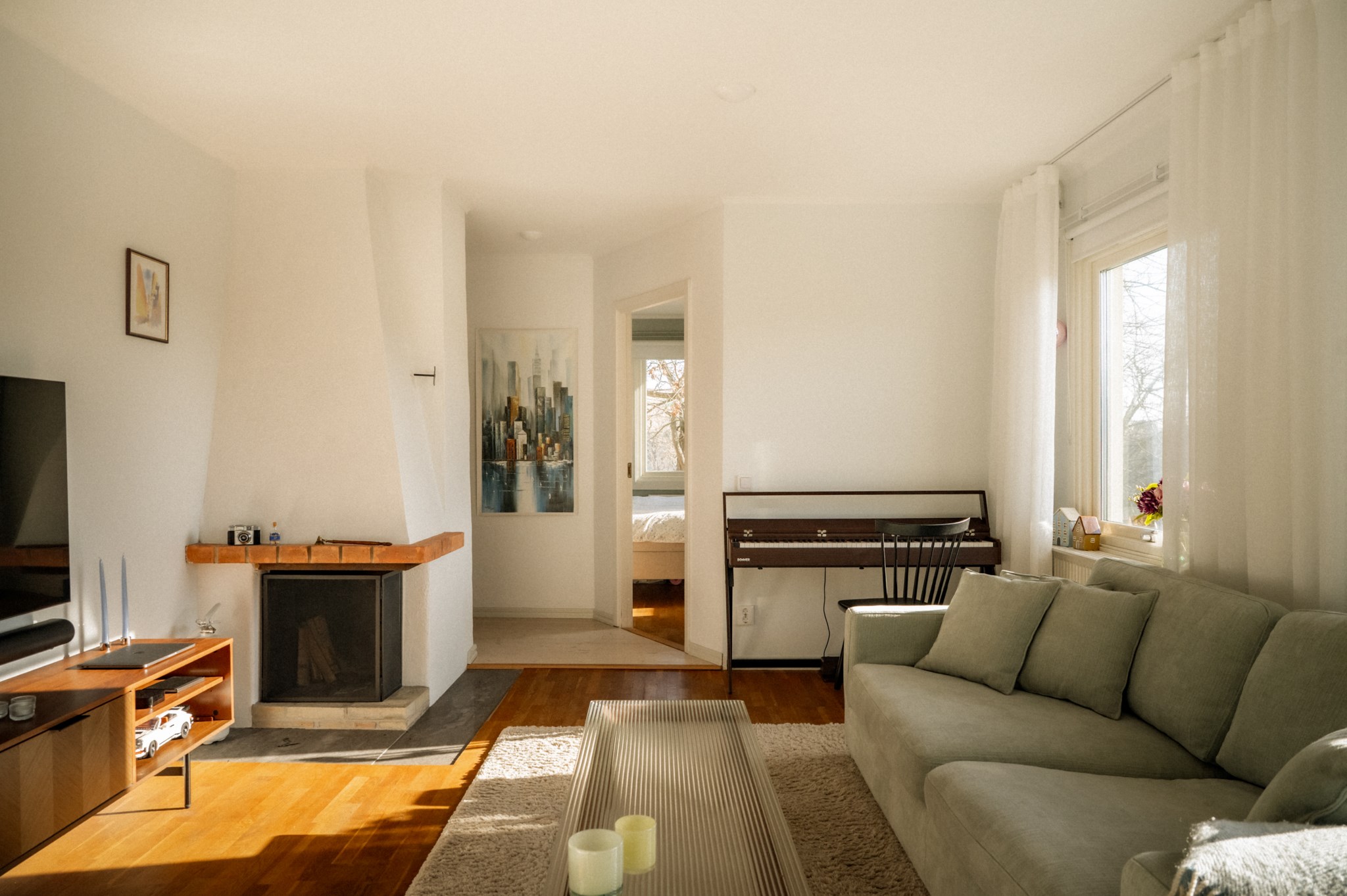 Vardagsrummet är bostadens naturliga samlingspunkt. Rummet är luftigt, lättmöblerat och erbjuder gott om plats för en större soffgrupp, TV-möbel och ytterligare möblering efter behov. Här finns också en detalj som är allt mer sällsynt i dagens bostäder – en fungerande öppen spis. Den skapar inte bara en estetisk mittpunkt i rummet utan bidrar också till en varm och inbjudande stämning under årets kallare månader. Eldens sken förvandlar snabbt vardagskvällar till något lite mer speciellt.
