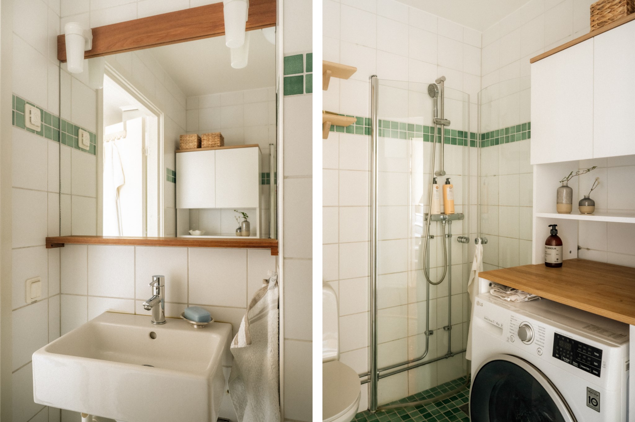 Badrummet är helkaklat och funktionellt utformat med dusch bakom glasväggar, kommod med förvaring samt tvättmaskin – en bekvämlighet som förenklar vardagen.